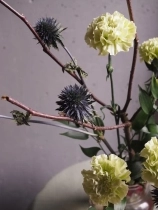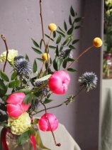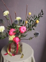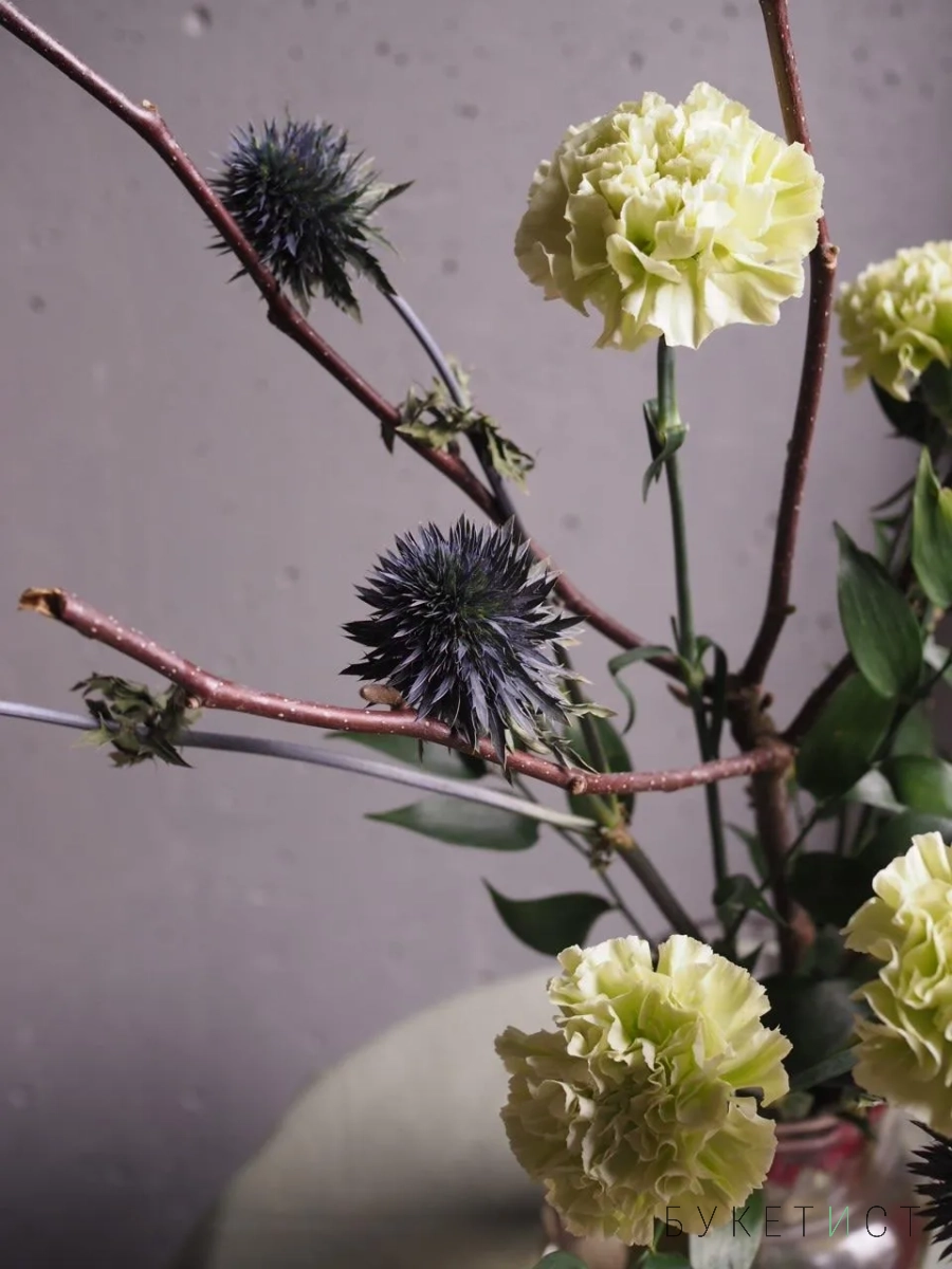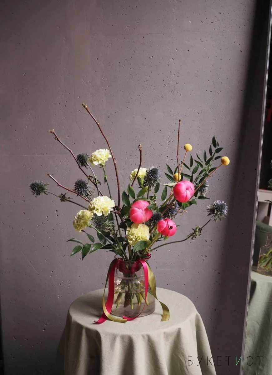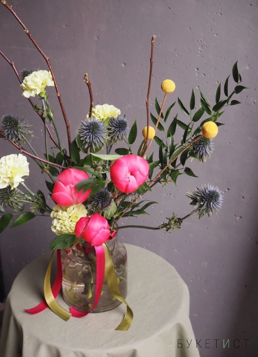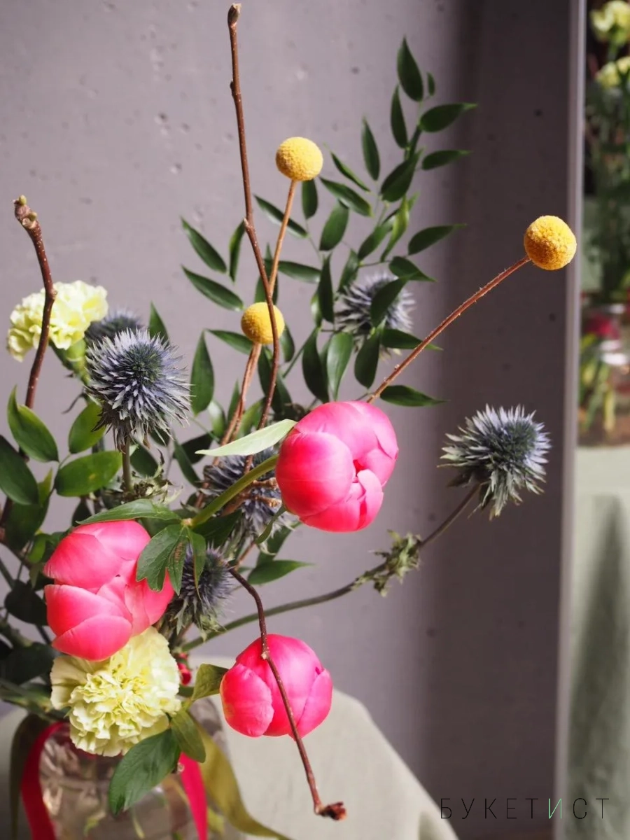 В составе букета: пионы сорта "Корал Шарм", декоративные ветки магнолии, краспедия, эрингиум, рускус и ажурные диантусы.
