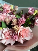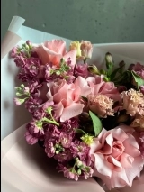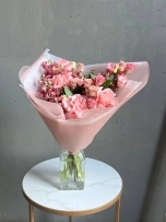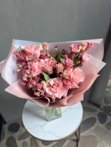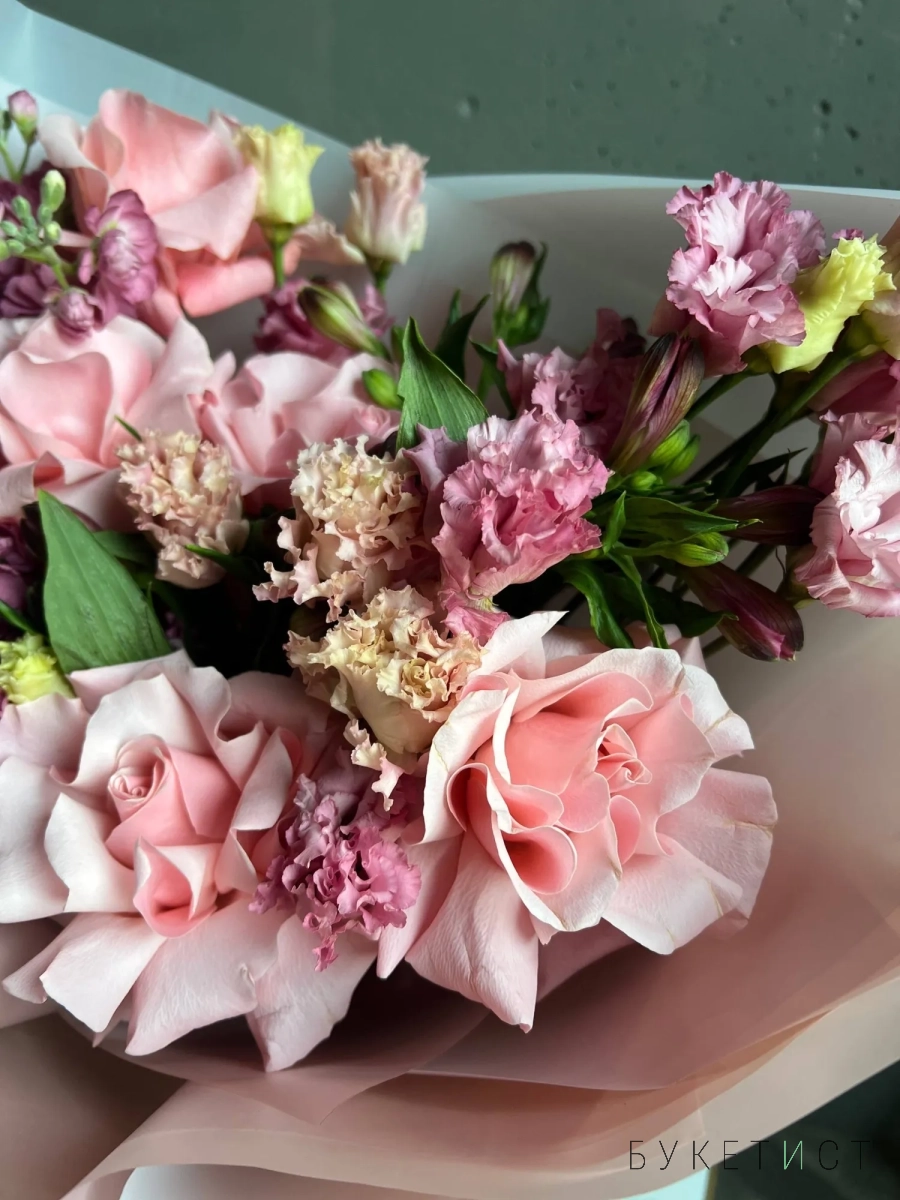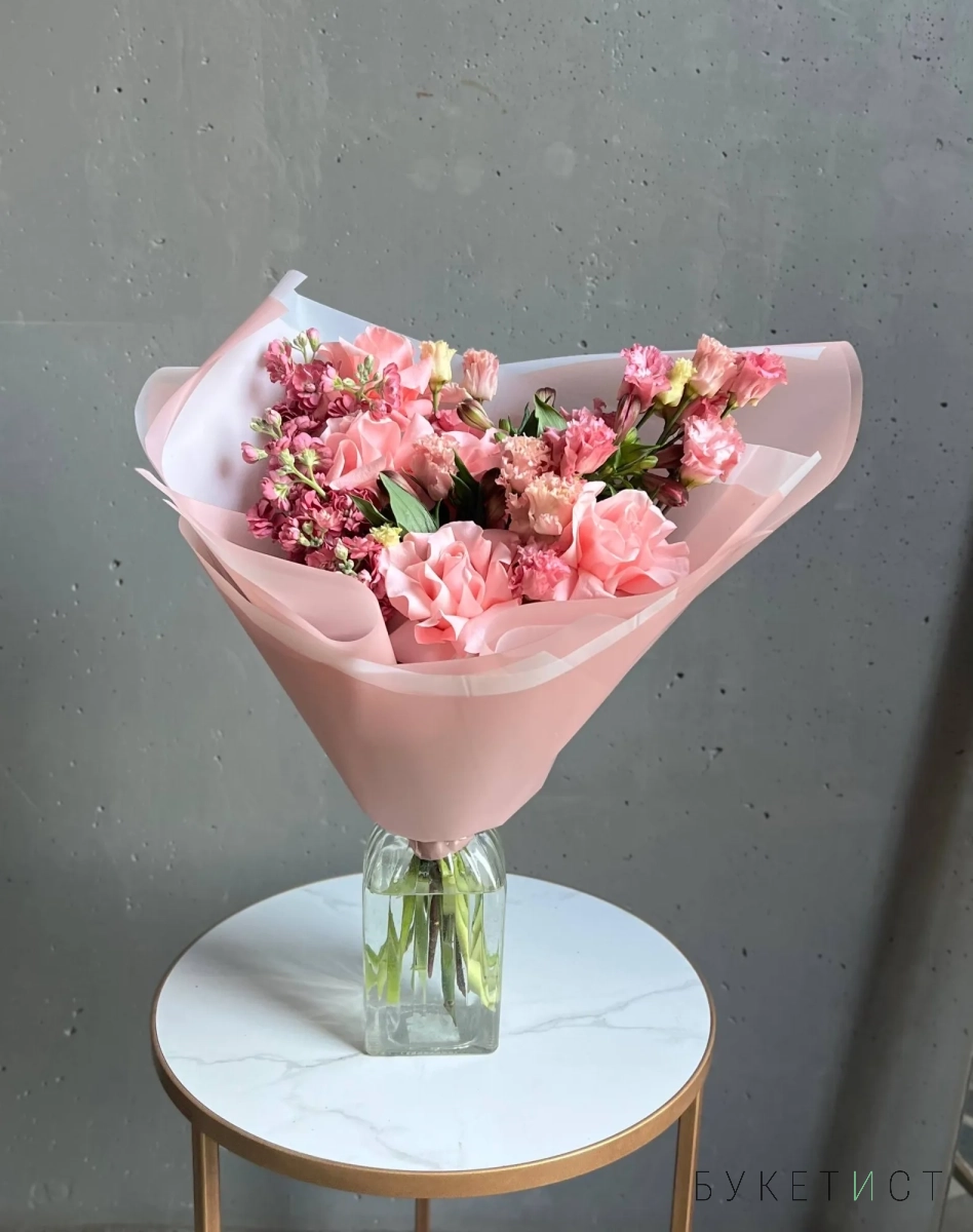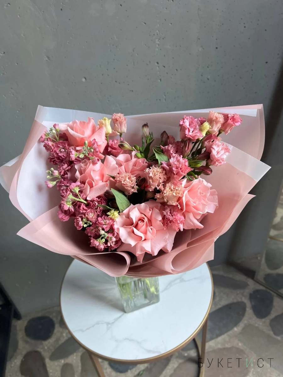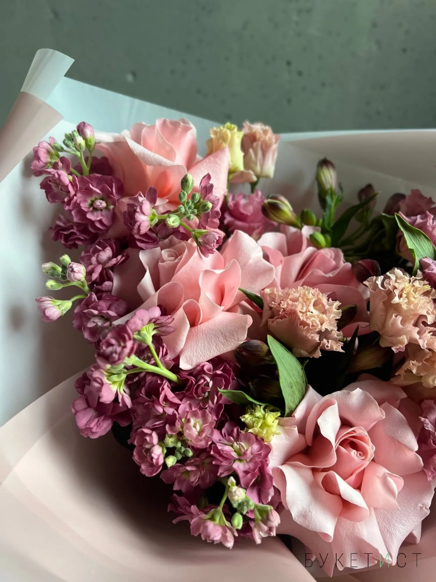 В составе букета: Ажурные розы в нежно-розовом оттенке, розовая эустома, альстромерия и малиновая ароматная маттиола.