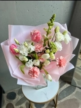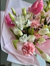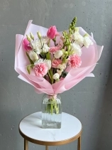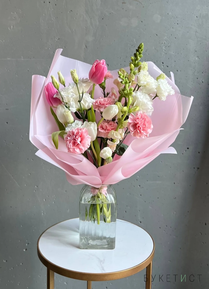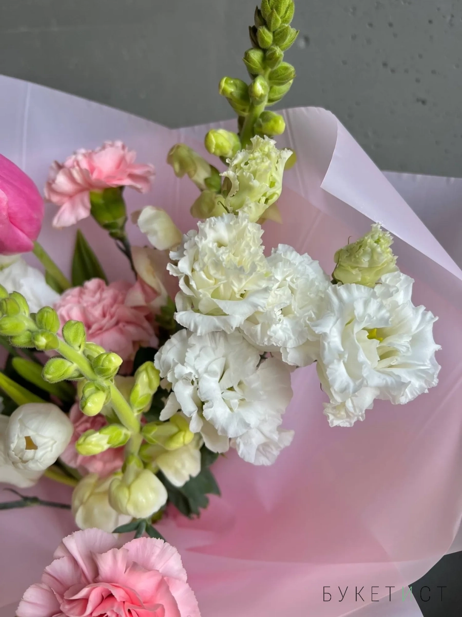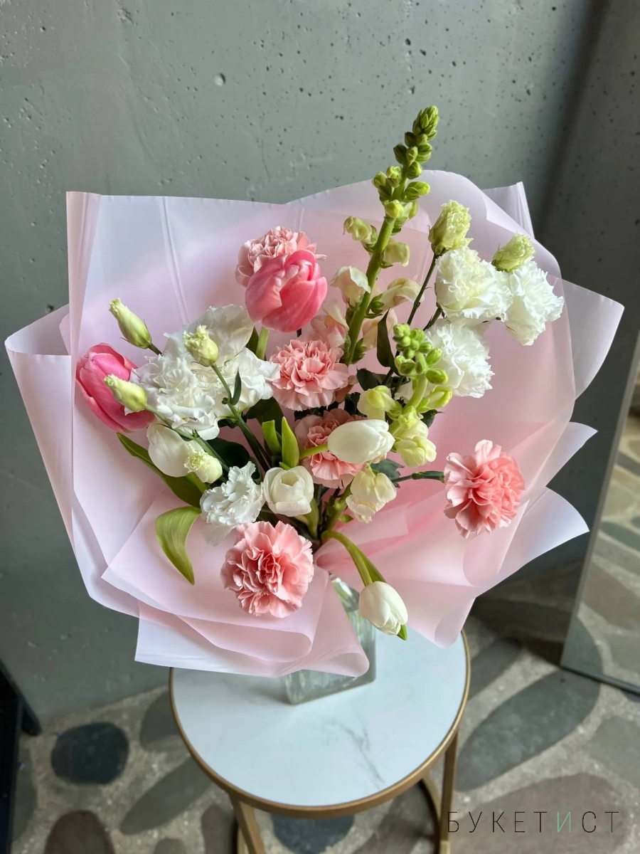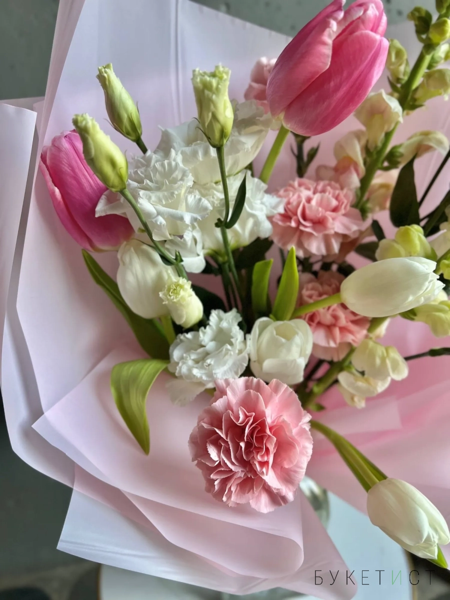 В составе букета: розовые тюльпаны, стойкие гвоздики, белые тюльпаны, эустома, леувенбек.