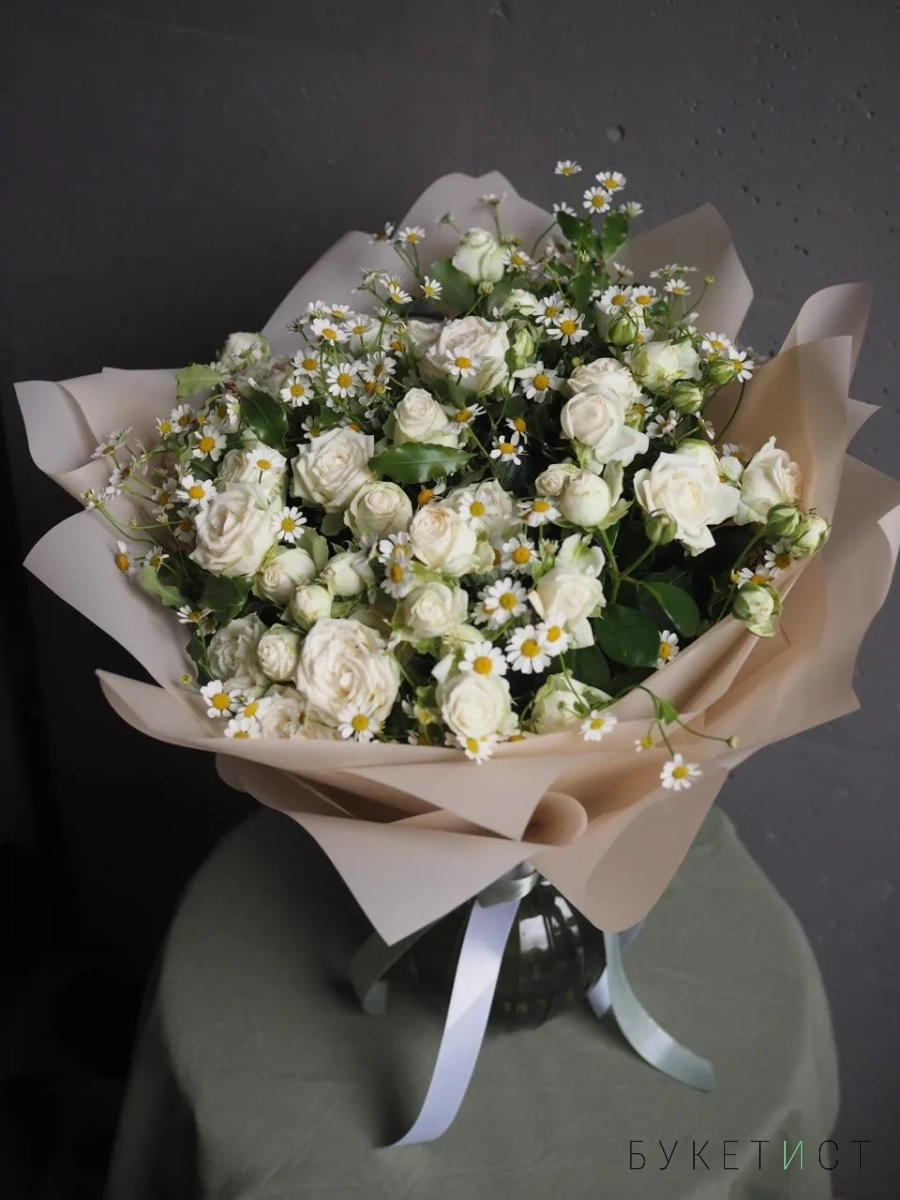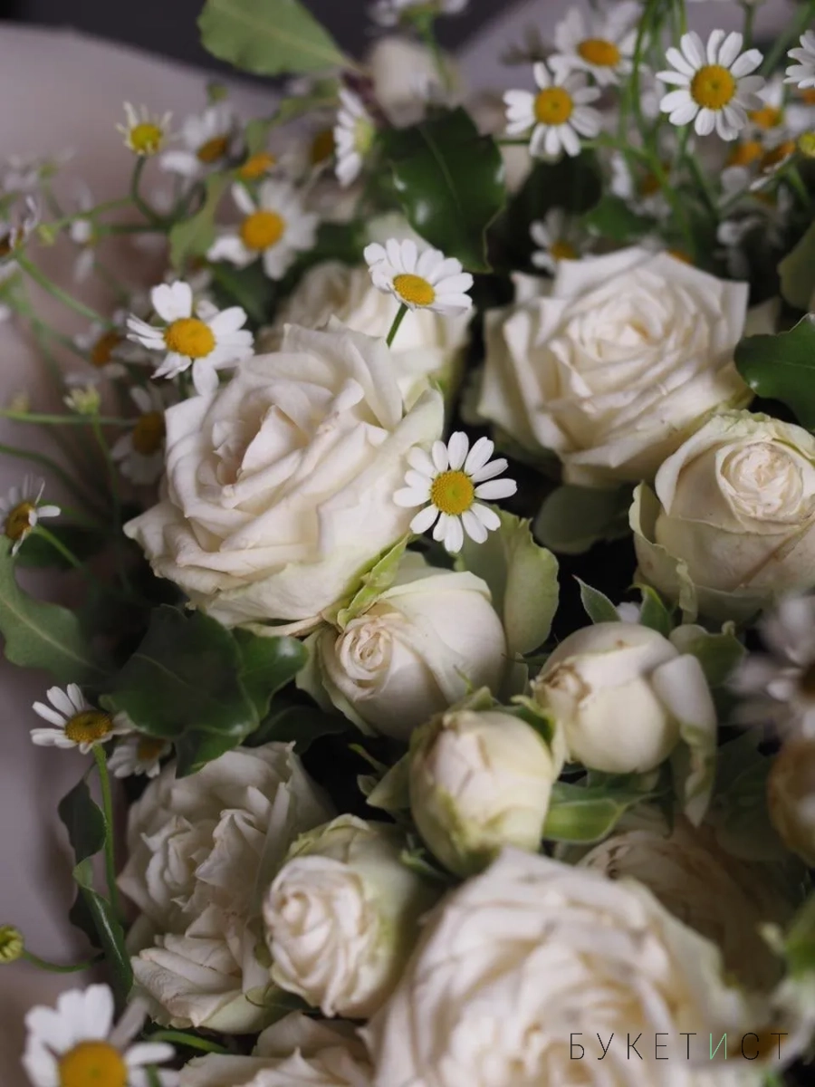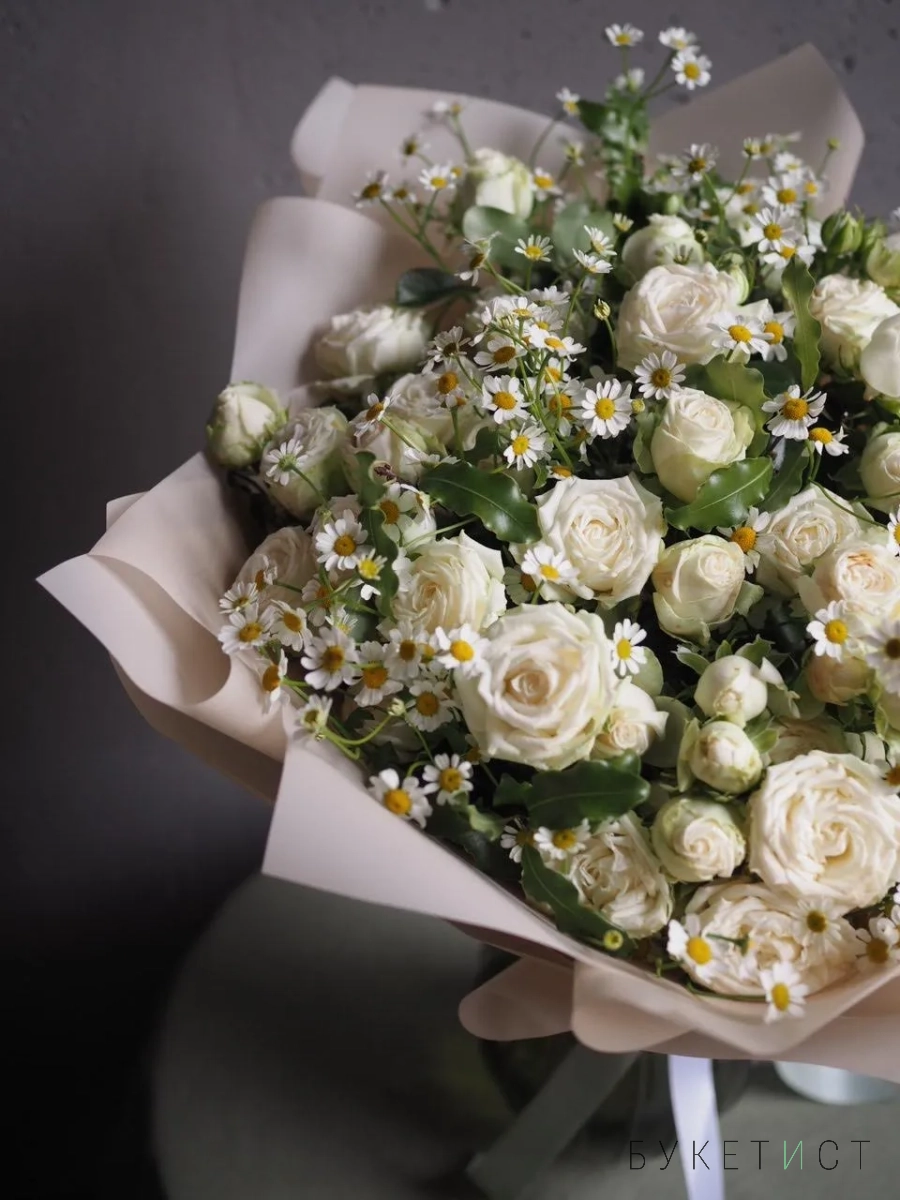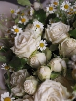 В составе букета: розы сорта "Мисс Бомбастик" и солнечные ромашки.