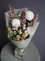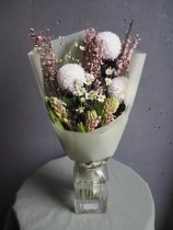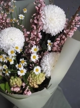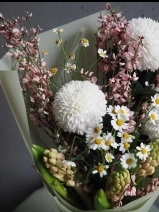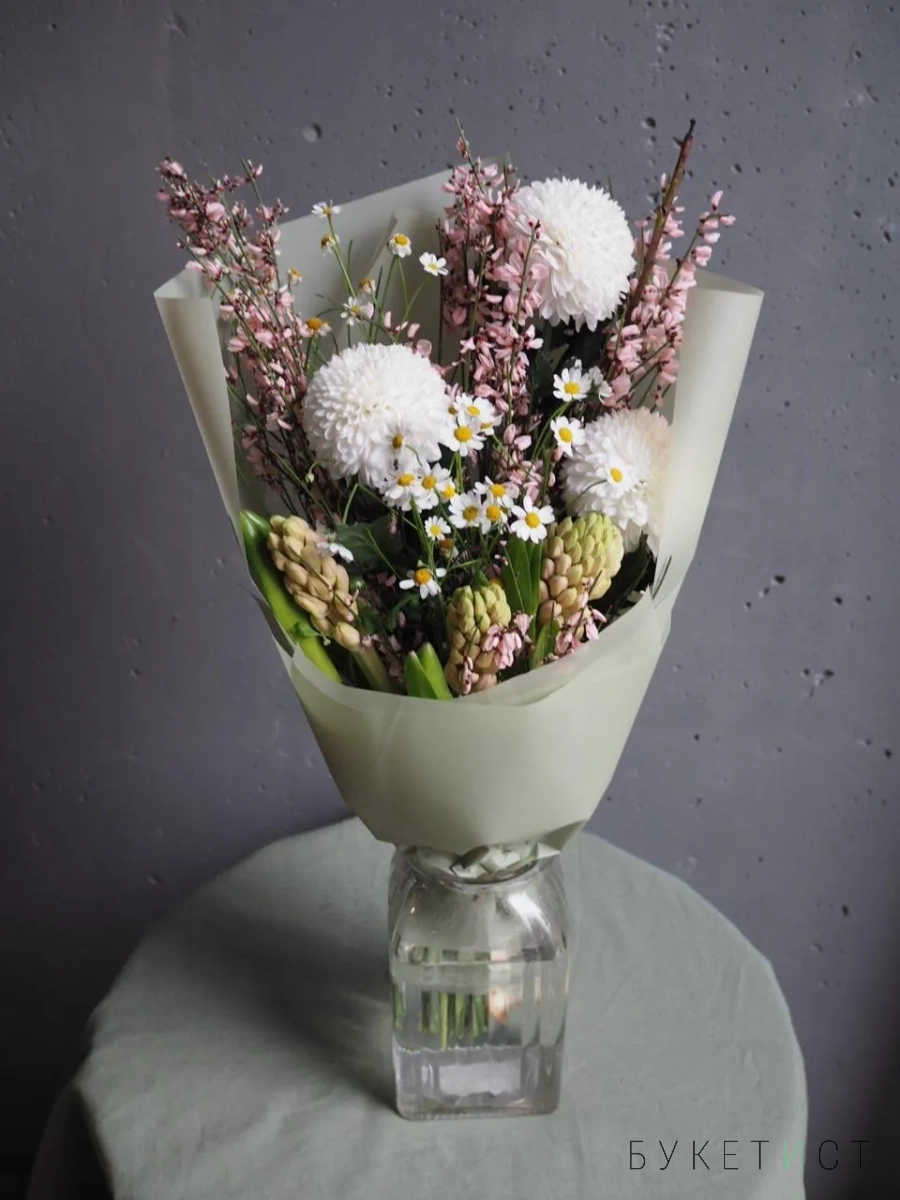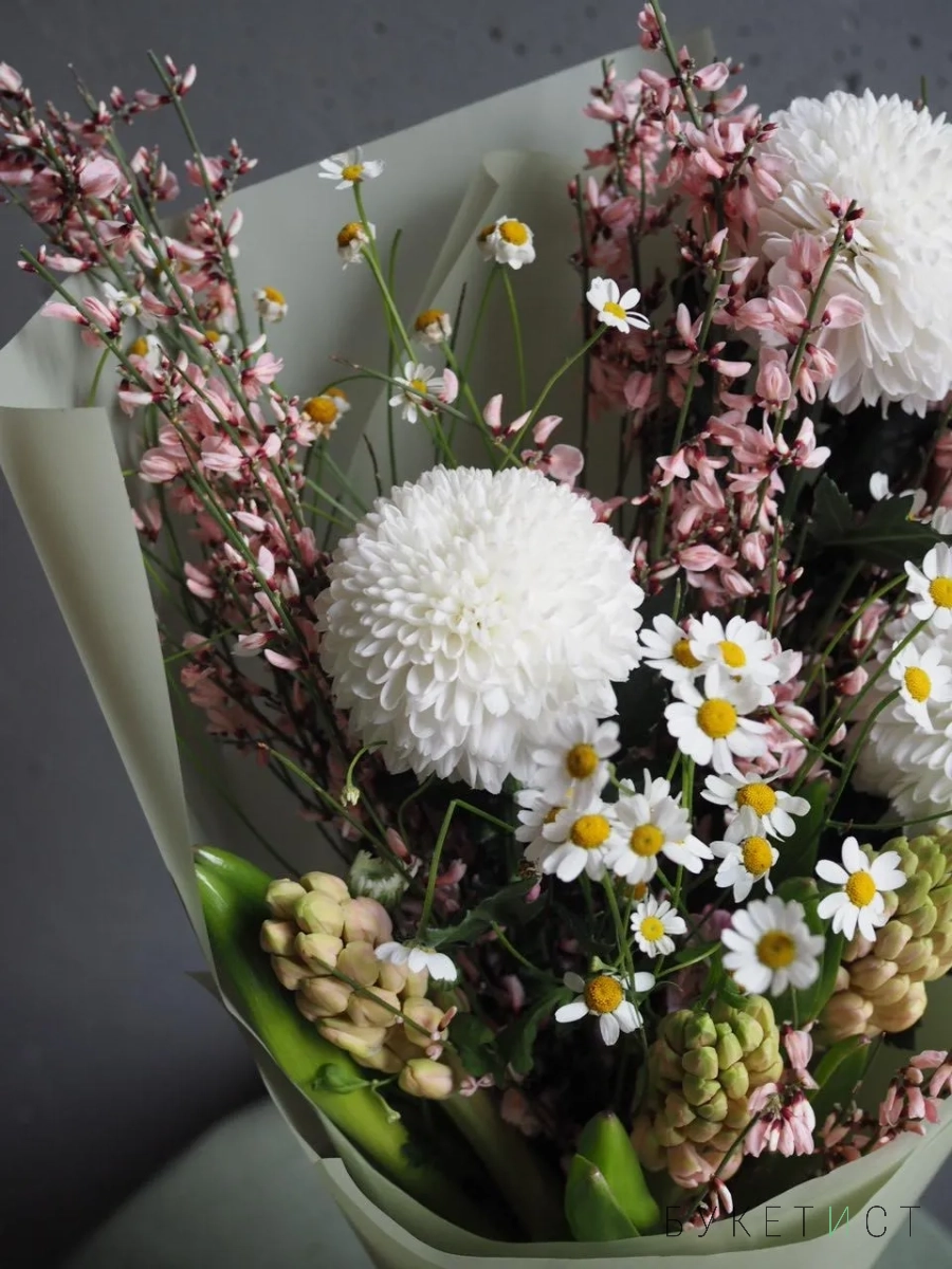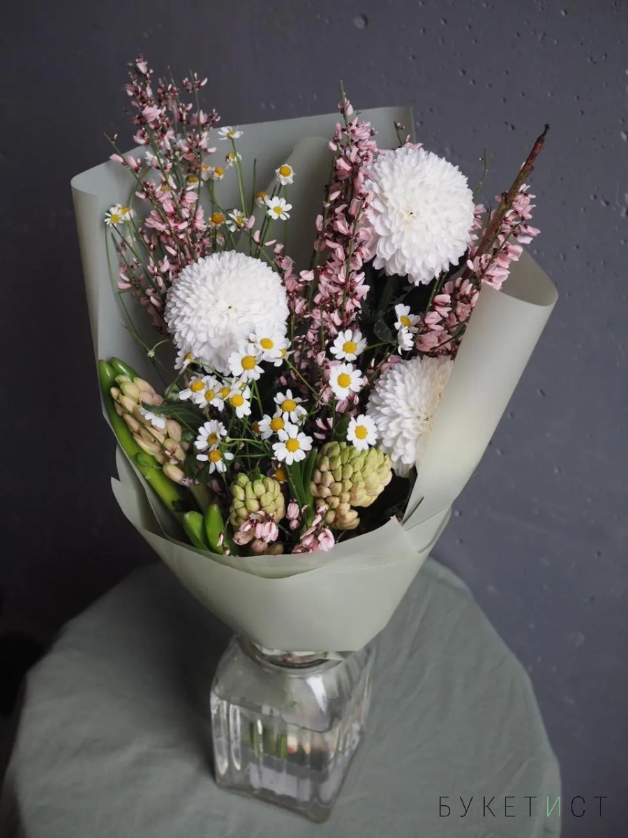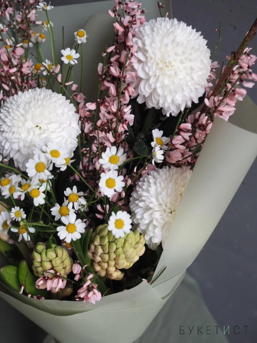 В составе букета: хризантемы сорта "Супербоул", ромашки, ароматная гениста и гиацинты.