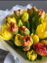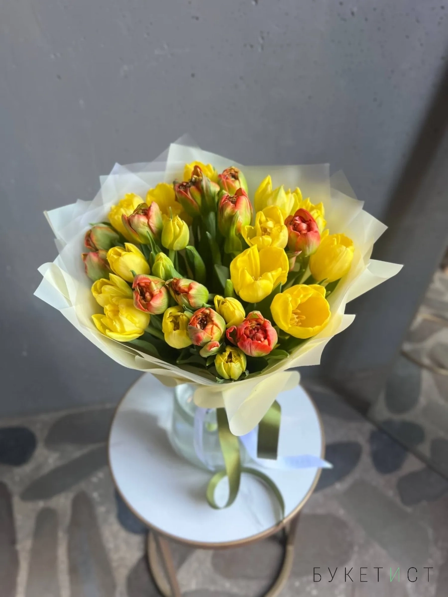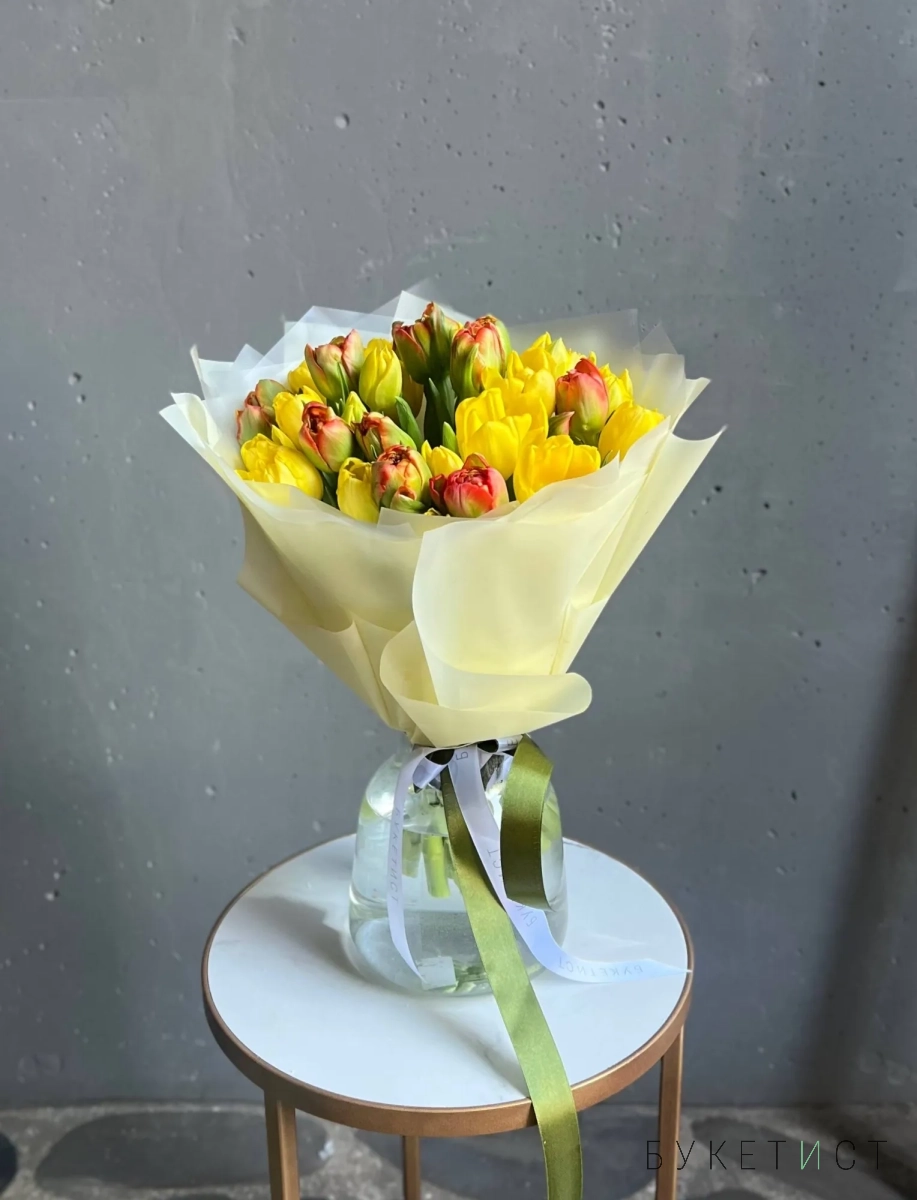 В составе букета: тюльпаны пионовидные желтые и рыжие