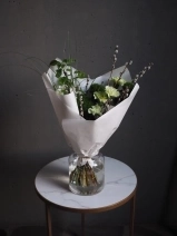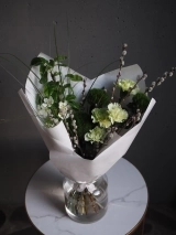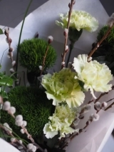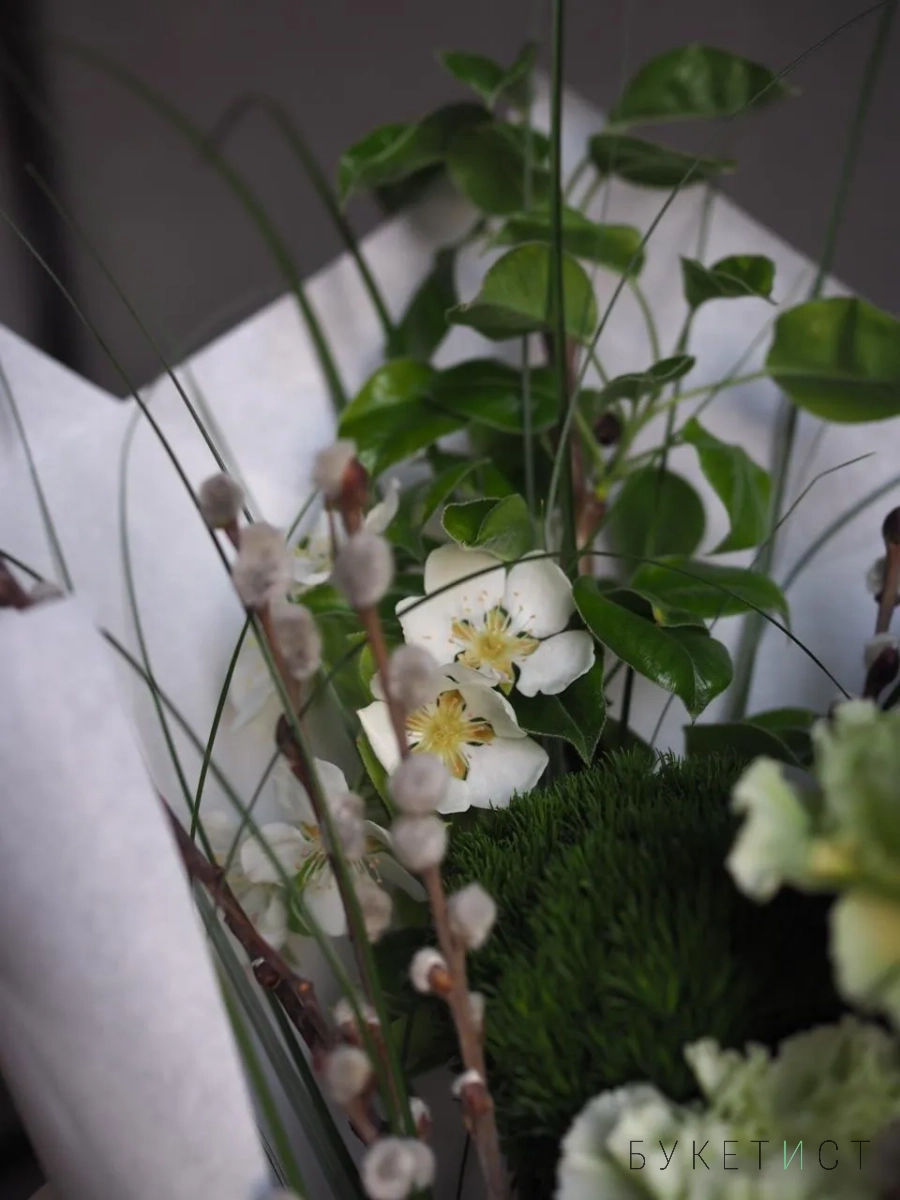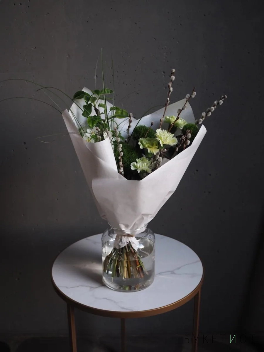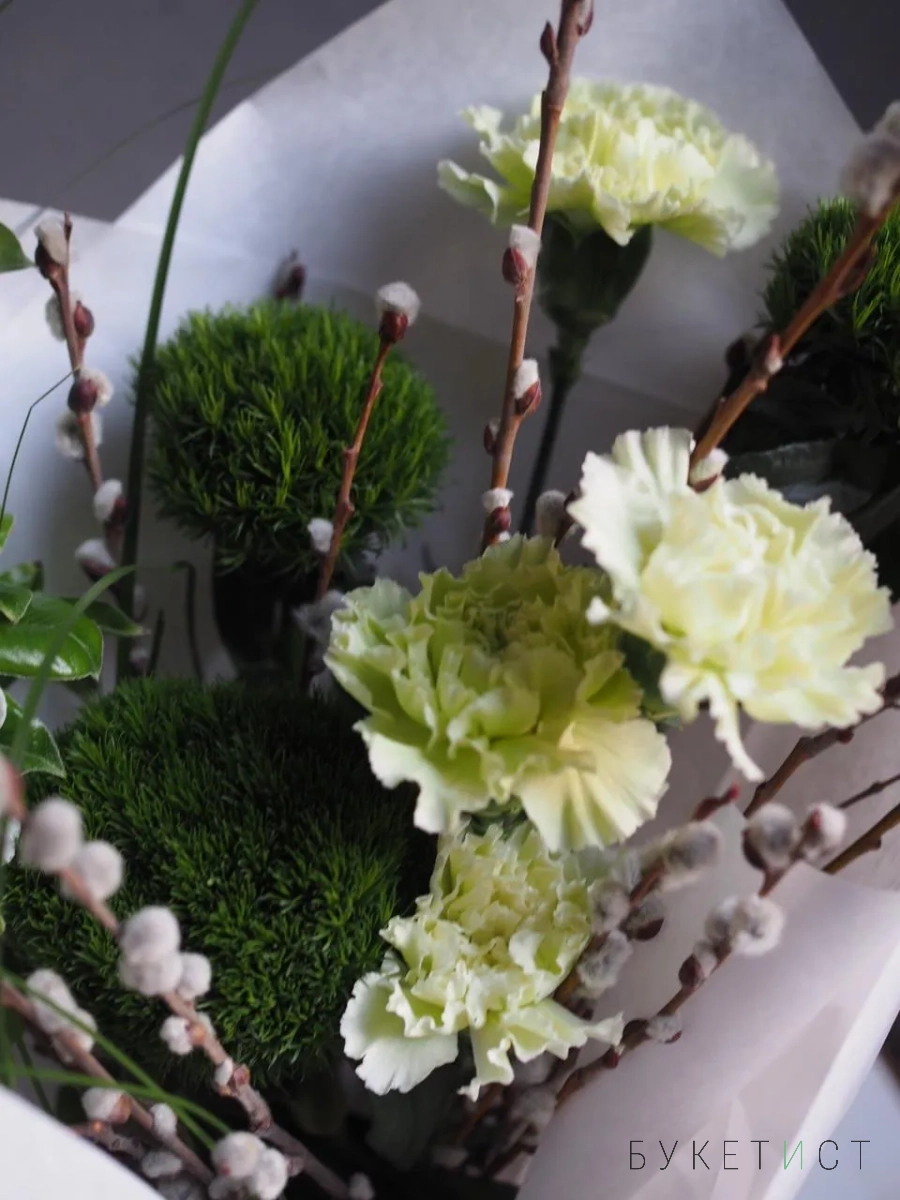 В составе букета: Стойкие диантусы, гвоздика сорта Грин Трик, веточки пушистой вербы, фермерские ветки цветущей груши и необычная трава