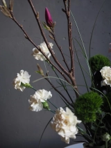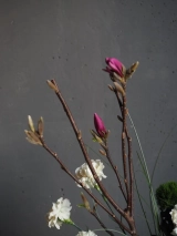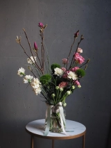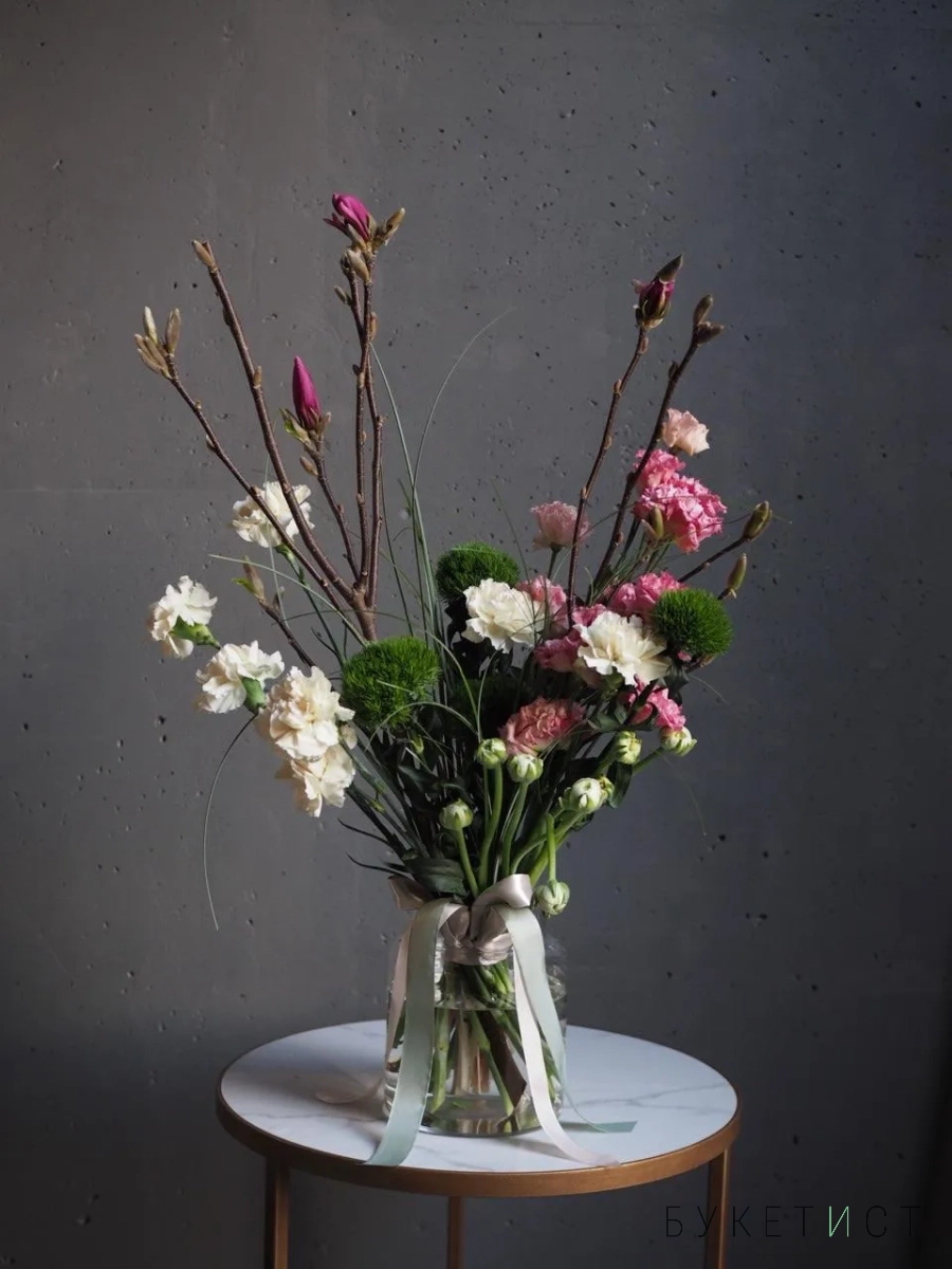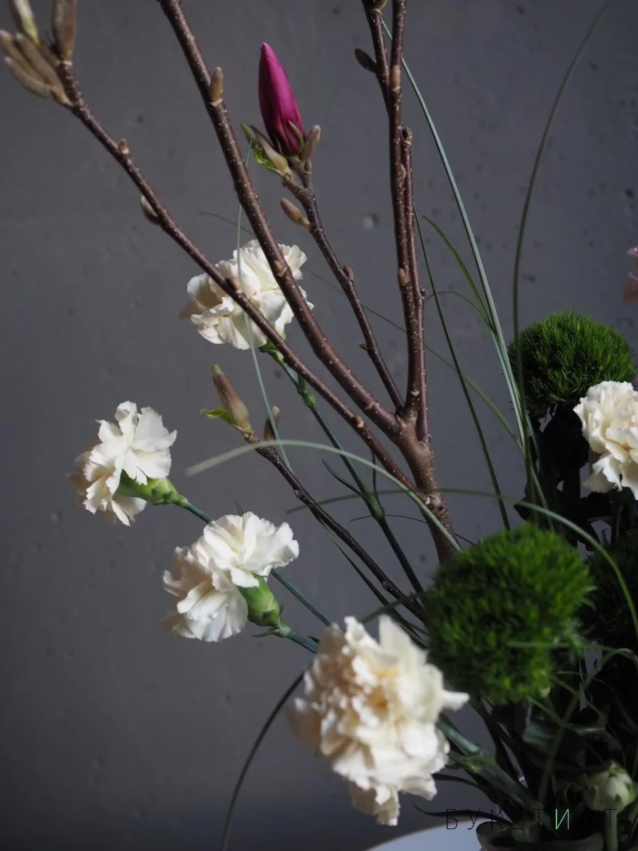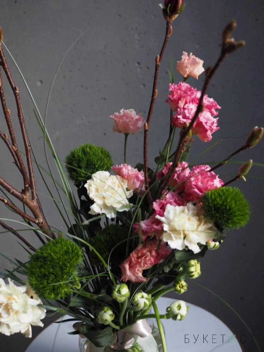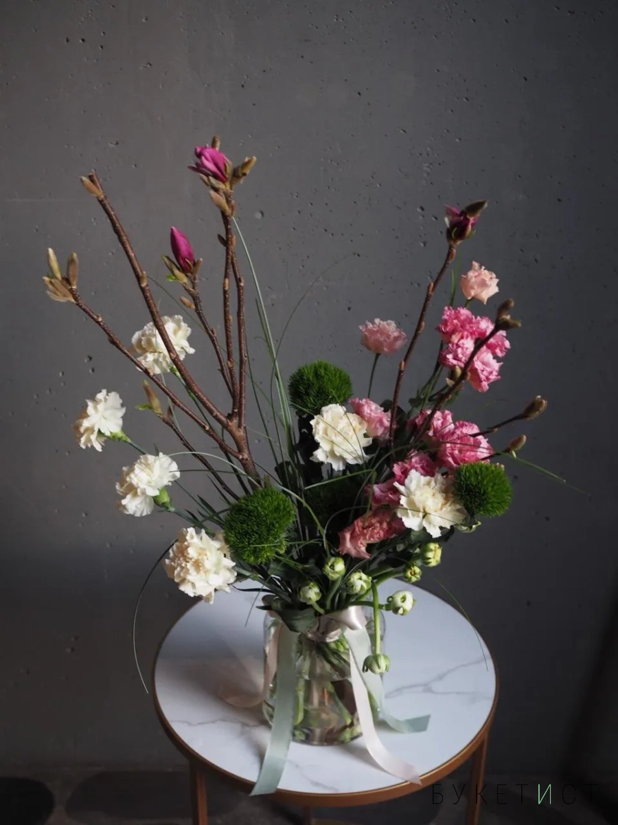 В составе букета: Утонченные веточки магнолии, диантус, эустома, грин-трик и сочный берграсс.