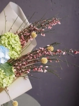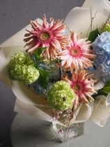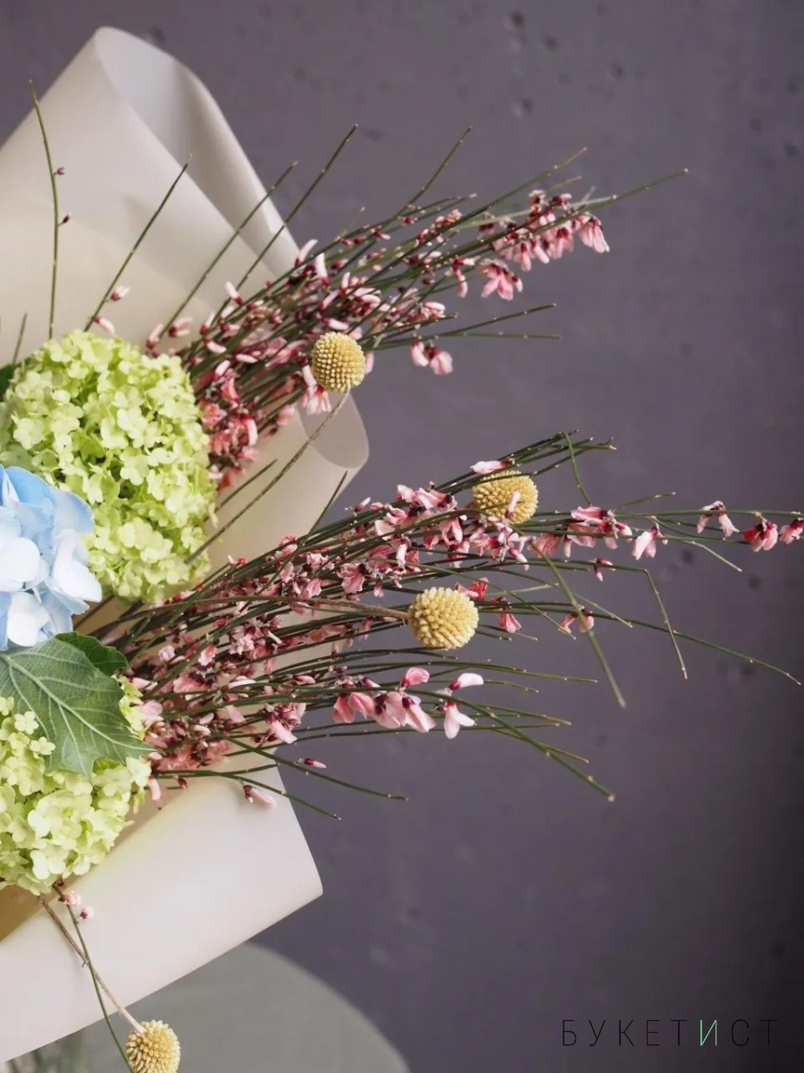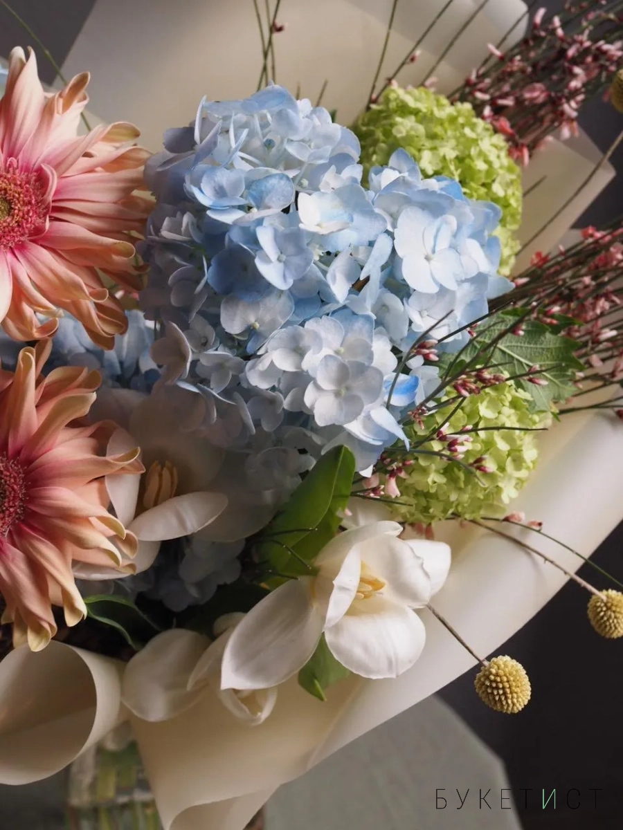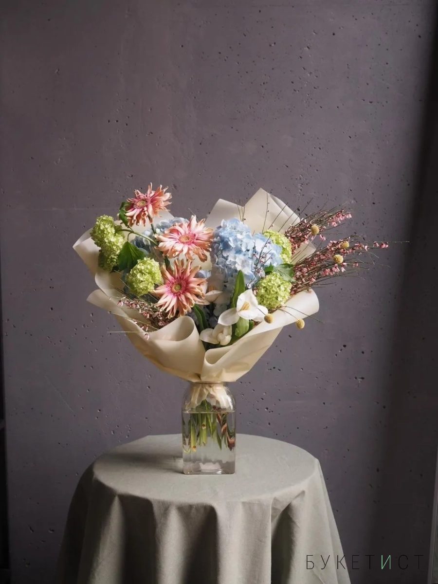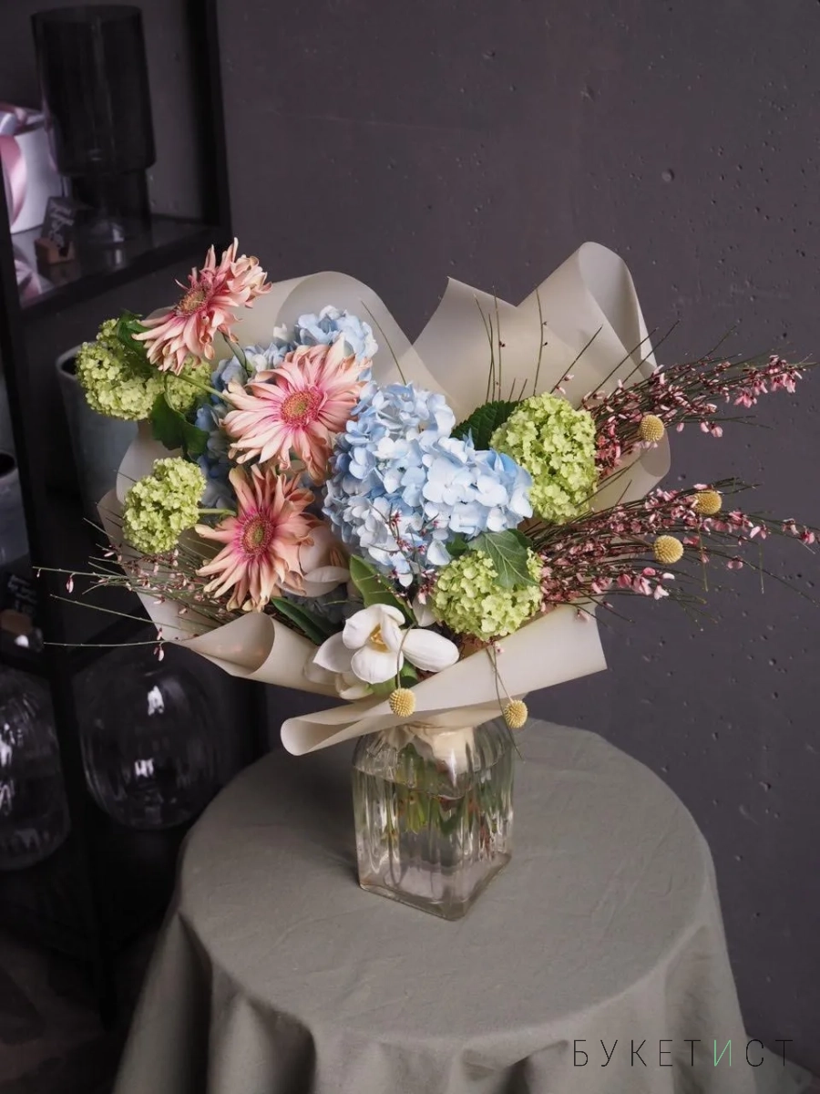В составе букета: необычные герберы сорта "Пастини", вибурнум, гортензия, белые тюльпаны, краспедия и ароматная гениста.