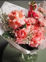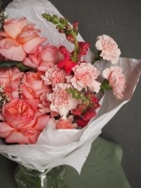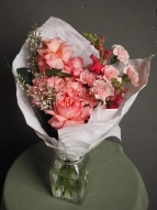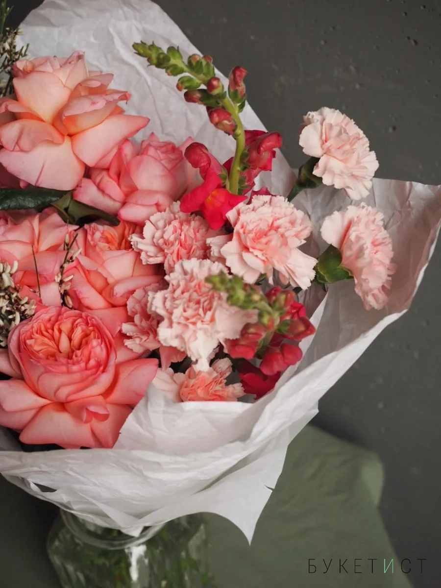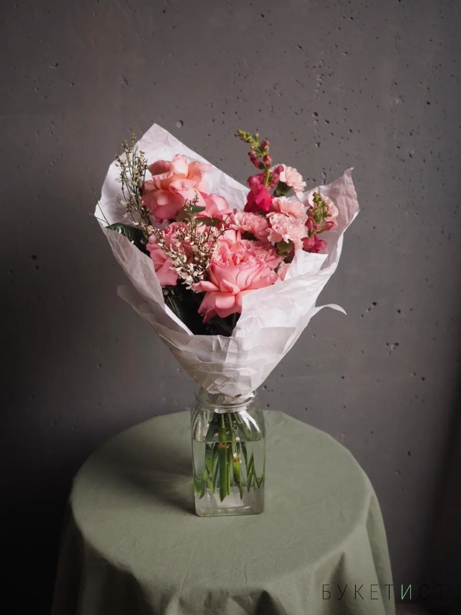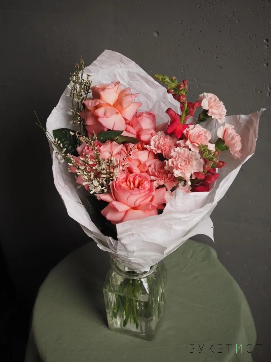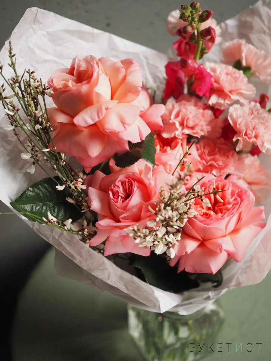 В составе букета: ажурные розы сорта "Pink expression", диантусы, ароматная гениста и леувенбек.