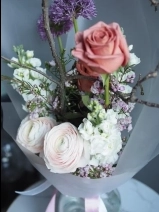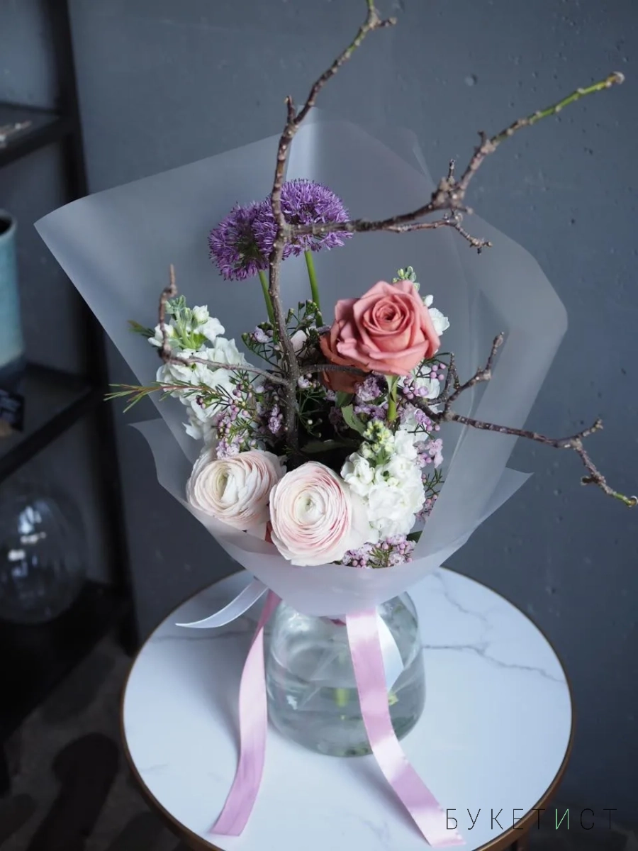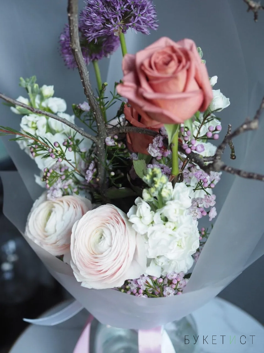 В составе букета: ранункулюс, ароматная маттиола, ветка магнолии, роза сорта Бариста, аллиум и хамилациум.