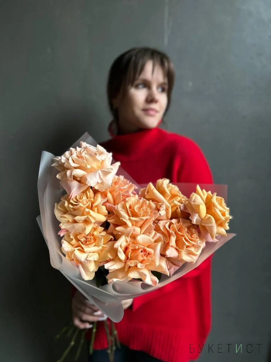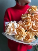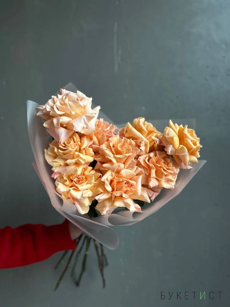 Монобукет из персиковых роз премиум-сорта Shimmer. Букет собран в разновысотной технике, а каждый лепесток розы вывернут вручную - так создается объем и особый эффект "кружева". На фото представлен букет из 9 стеблей. Прелесть, не правда ли?