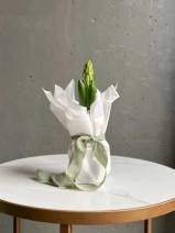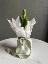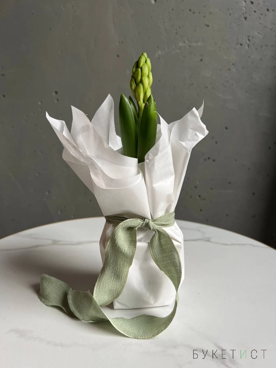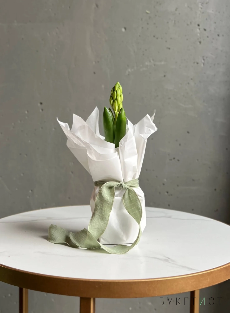 Нежная и аккуратная композиция из луковицы гиацинта, аккуратно обёрнутая в тишью, — это живой акцент, который радует не один день, а целую историю цветения.