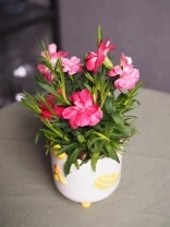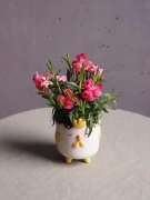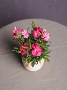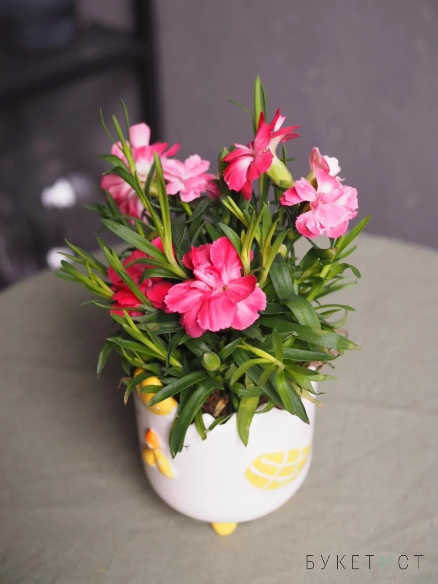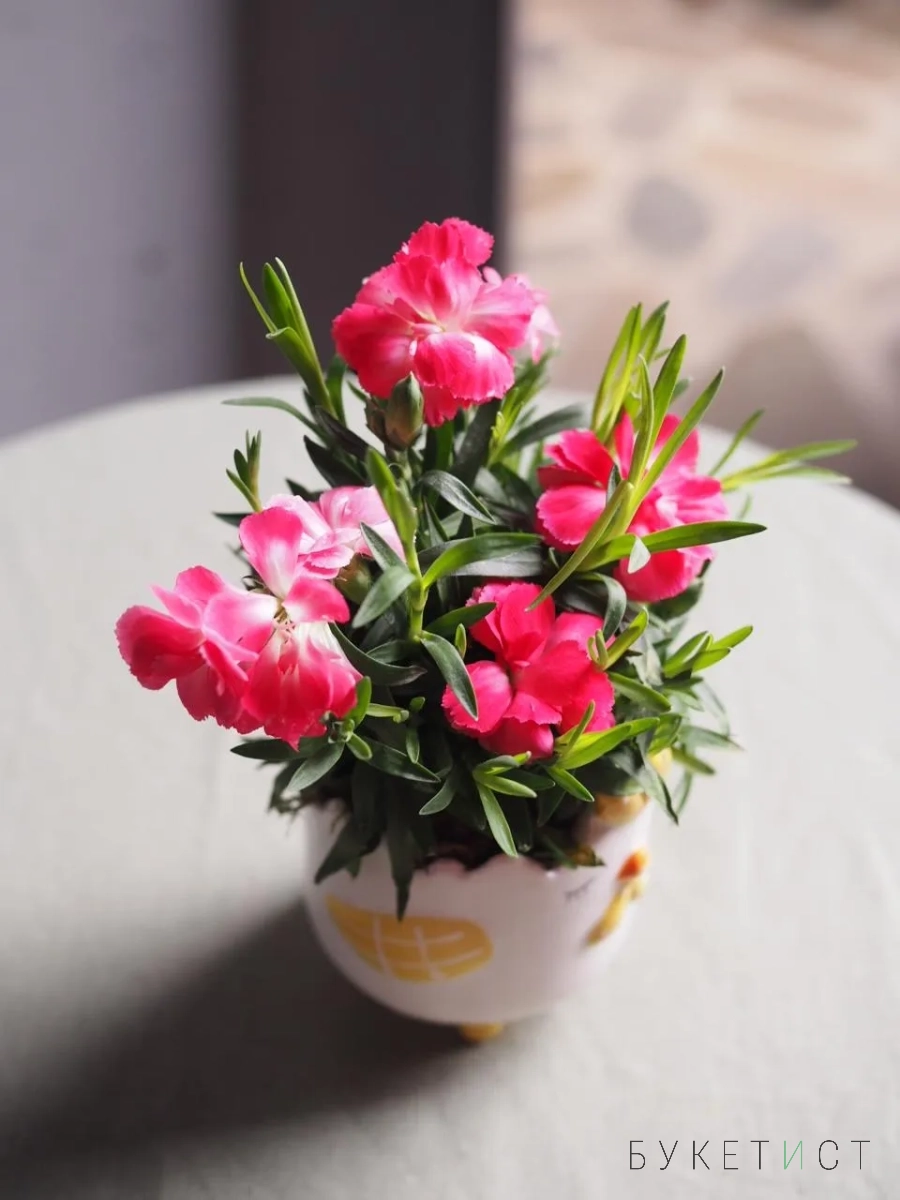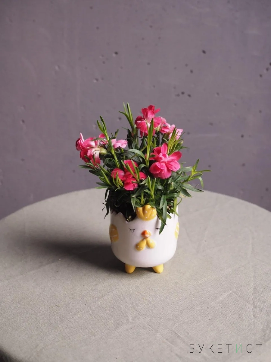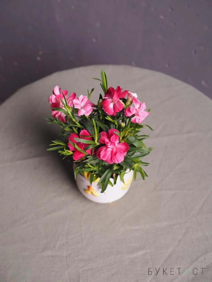 Яркое и весеннее кашпо, украшенное нежными кустовыми гвоздиками.. Идеально подходит для создания уютной атмосферы и станет прекрасным подарком для близких.