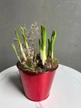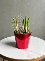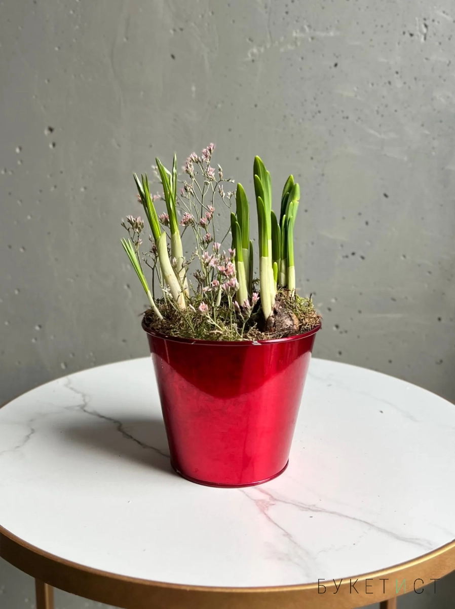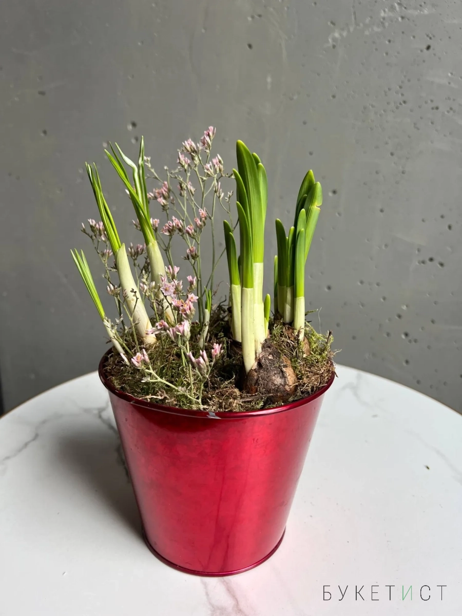 Нежная весенняя композиция из луковиц ирисов и нарциссов с добавлением лимониума в красном металлическом кашпо — это не просто букет, а маленькое чудо с продолжением!
