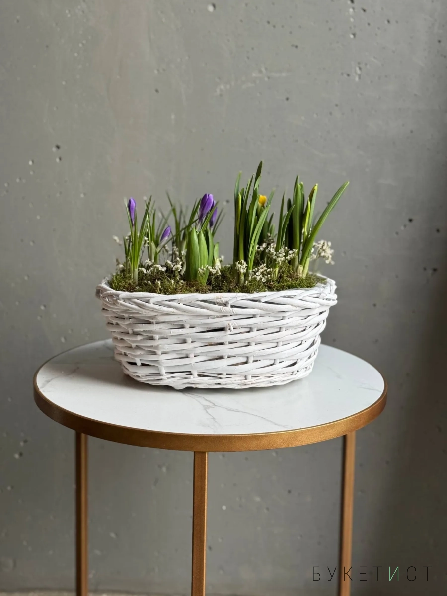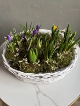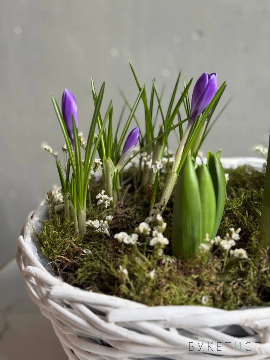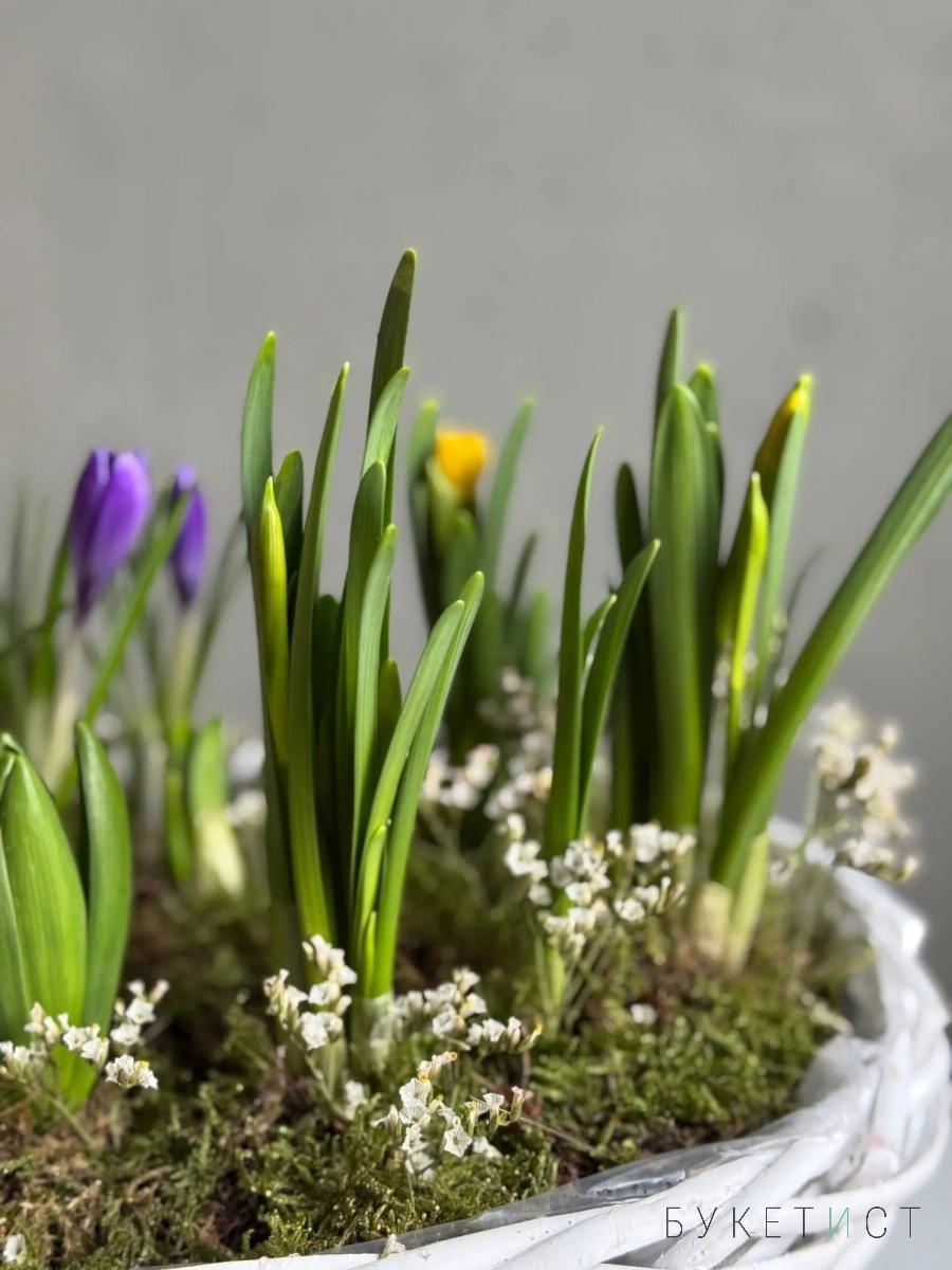 Нежная и аккуратная композиция из луковиц гиацинтов, нарциссов и ирисов - это живой акцент, который радует не один день, а целую историю цветения.
