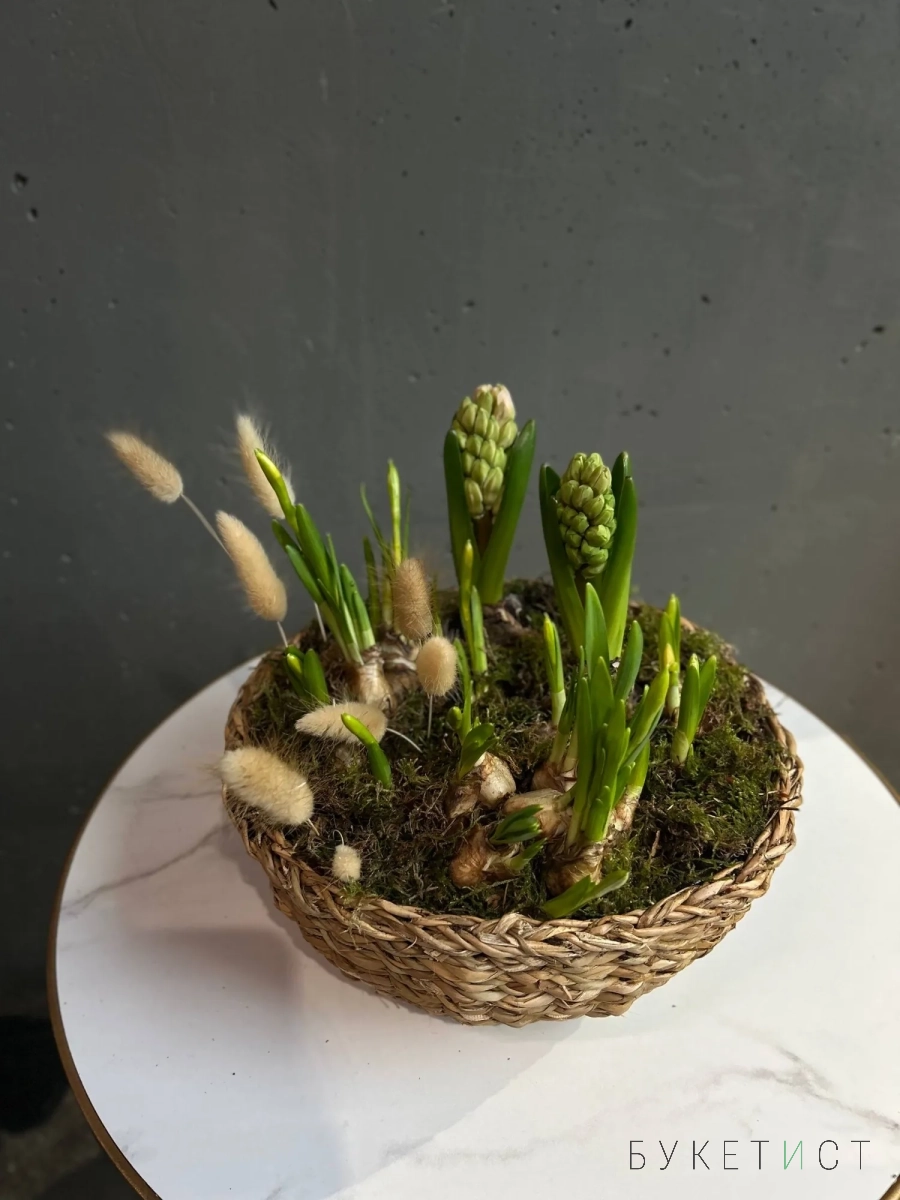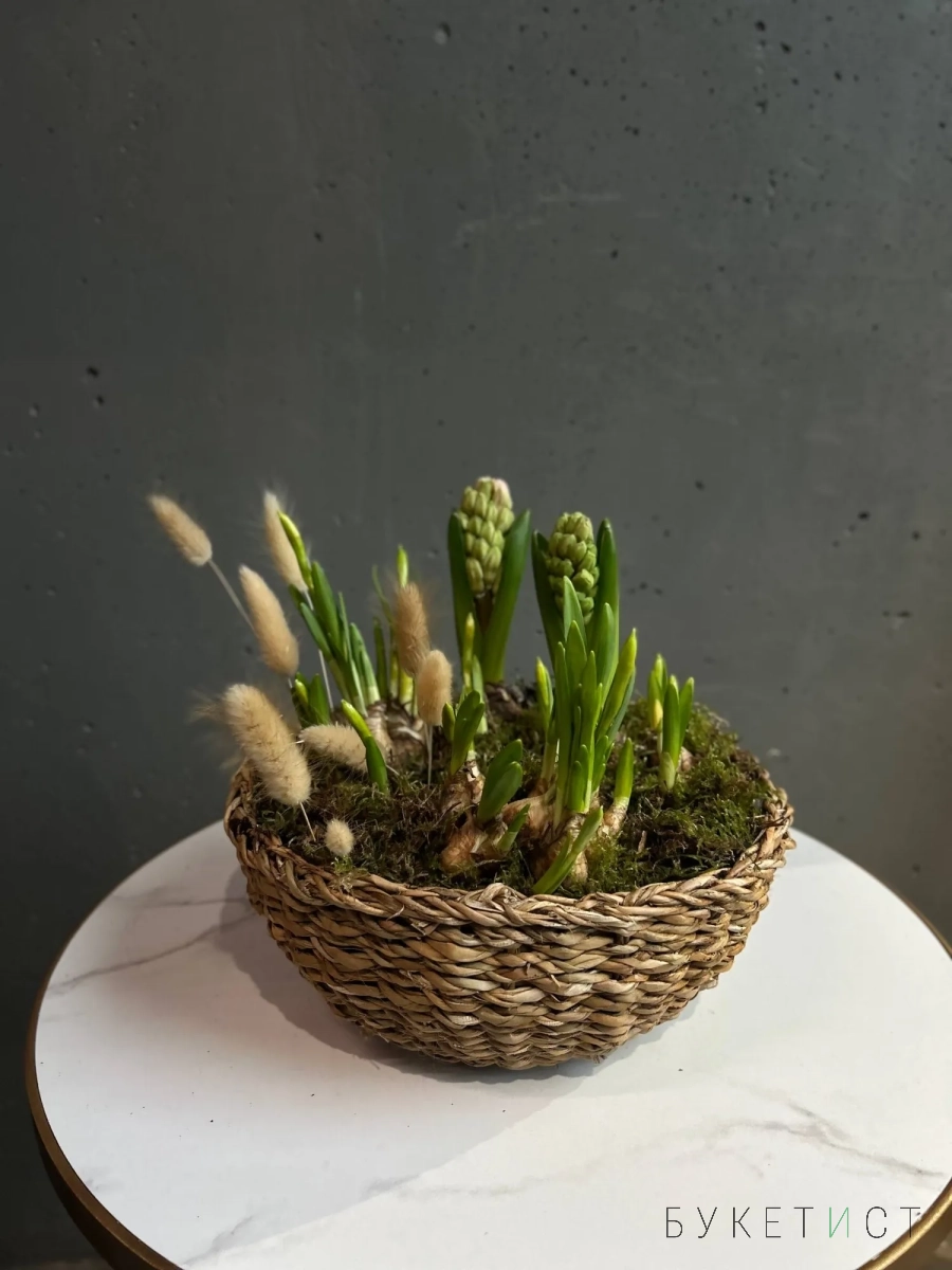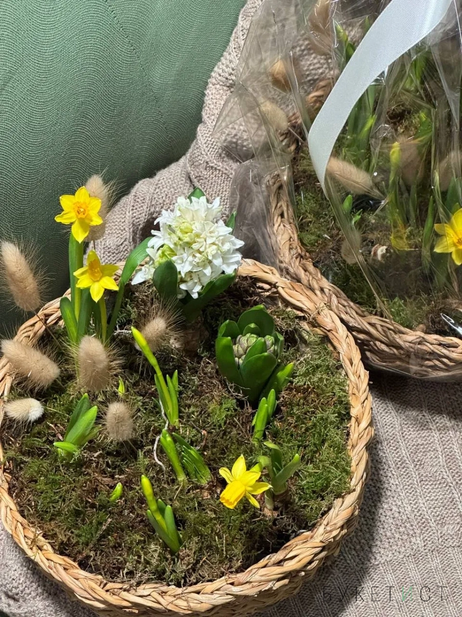 Нежная и аккуратная композиция из луковиц гиацинтов и нарциссов - это живой акцент, который радует не один день, а целую историю цветения.