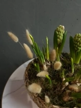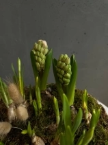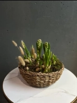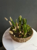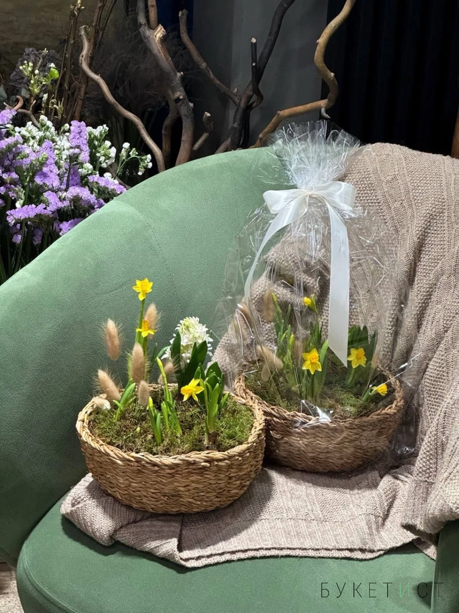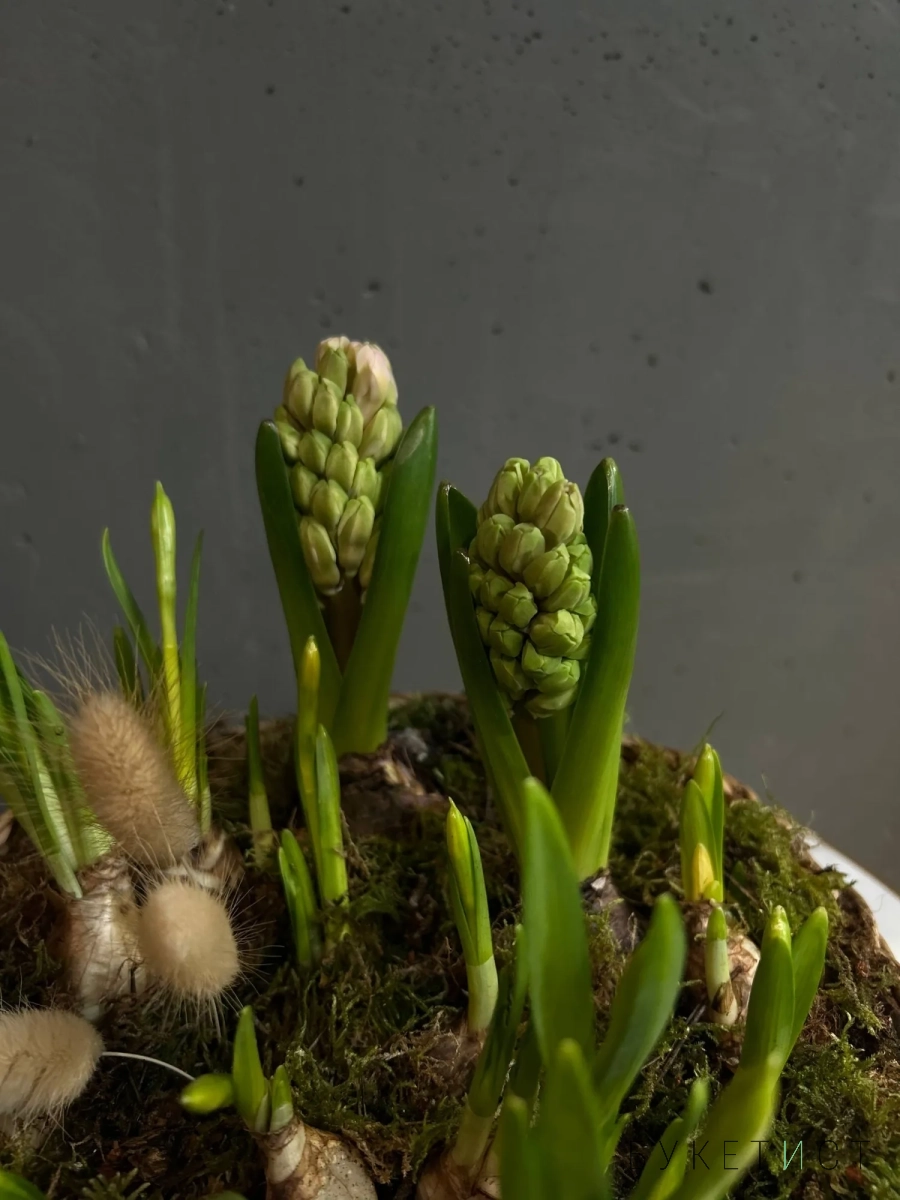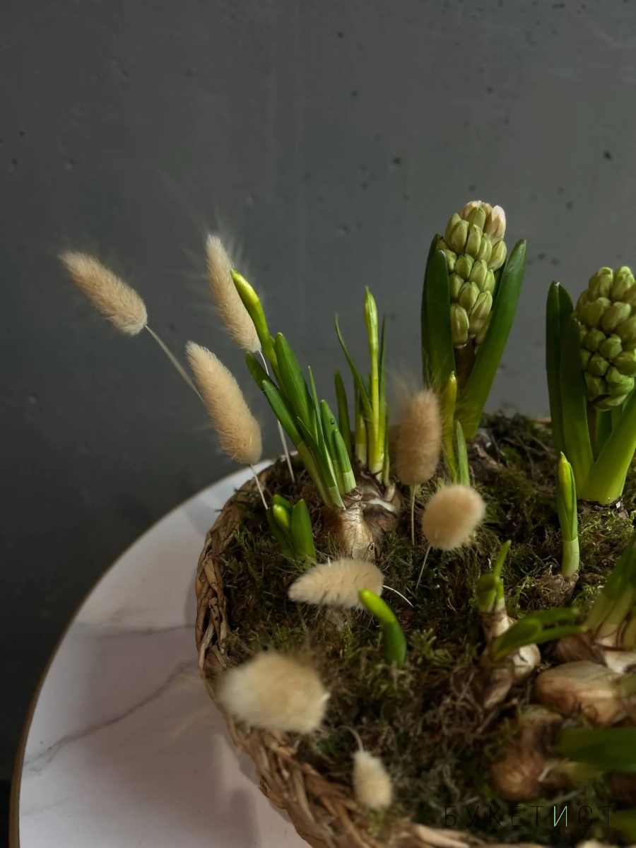 Нежная и аккуратная композиция из луковиц гиацинтов и нарциссов - это живой акцент, который радует не один день, а целую историю цветения.