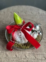 Живые ветви ароматной ели устанавливаются в специальный материал, пропитанный водой - это позволяет изделию держать форму и сохранять свежесть как можно дольше. Украшения аккуратно крепим на специальный клей (не обходится и без особой флористической магии, конечно).