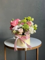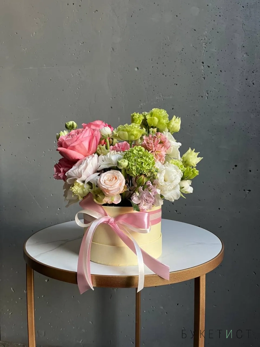 Композиция в шляпной коробке оттенка сливочного масла.