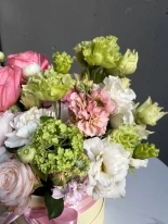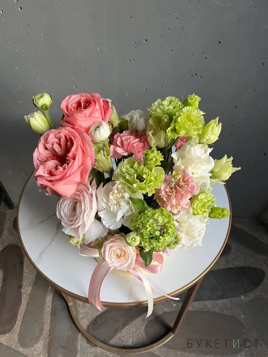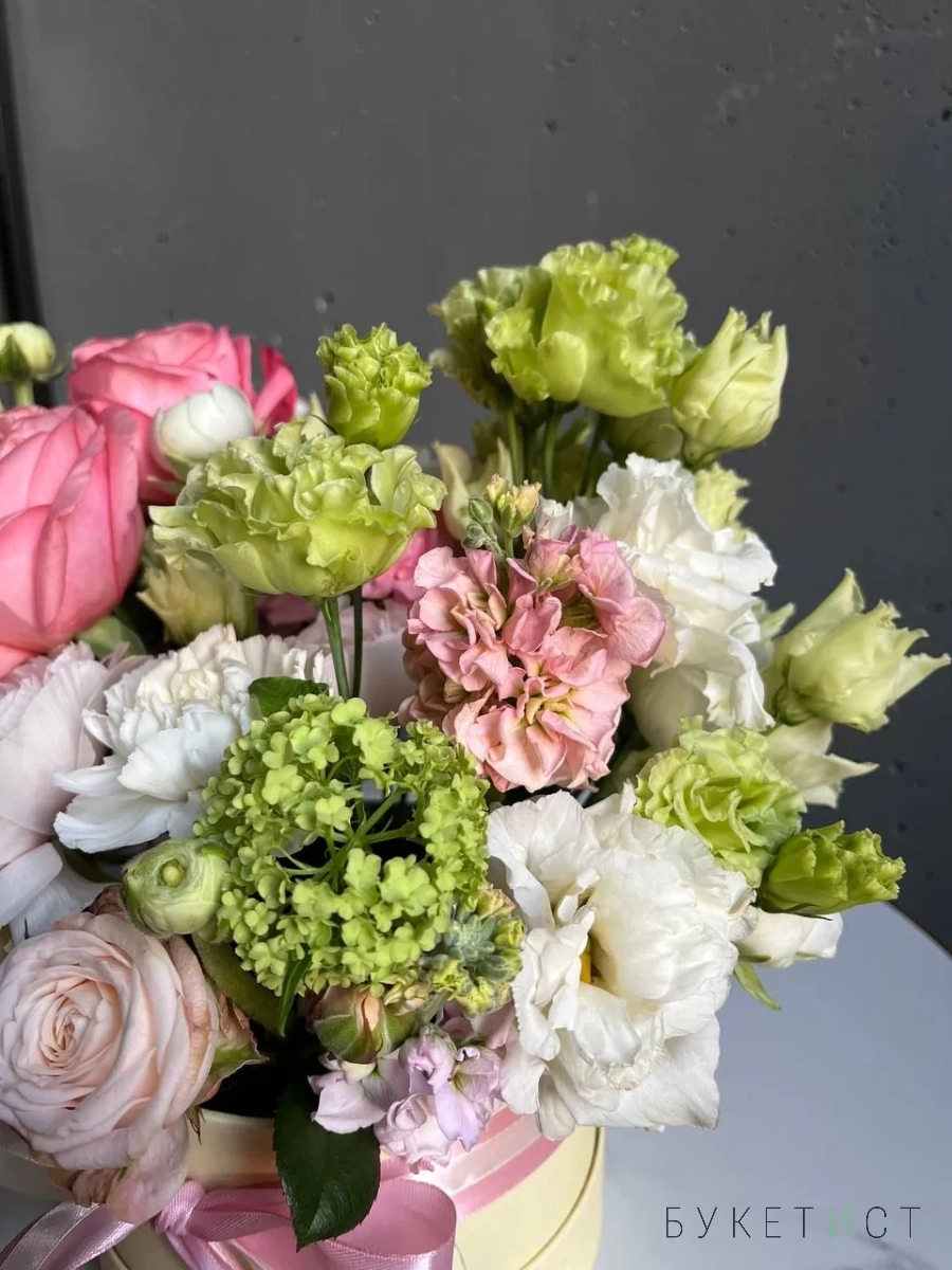 Композиция в шляпной коробке "Клубничный лайм" с ранункулюсами и вибурнумом