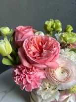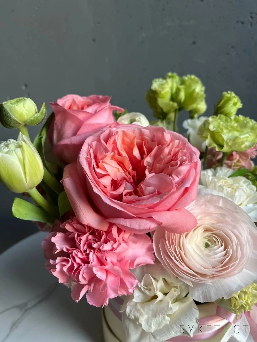 В составе: ажурные эустома и диантус, кремовый ранункулюс Ханой, ароматная маттиола, клубничная роза Пинк Экспрешен.