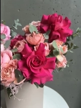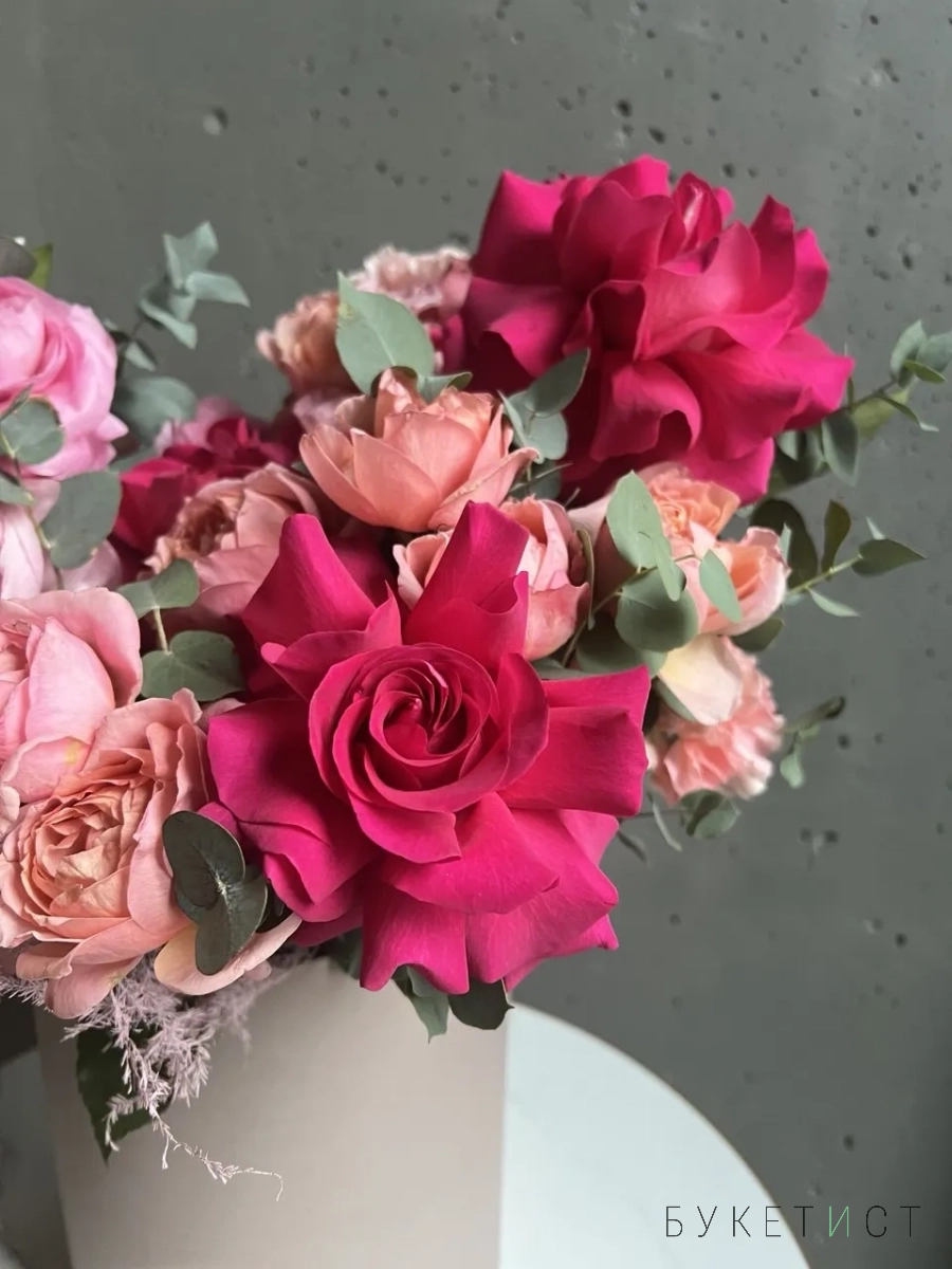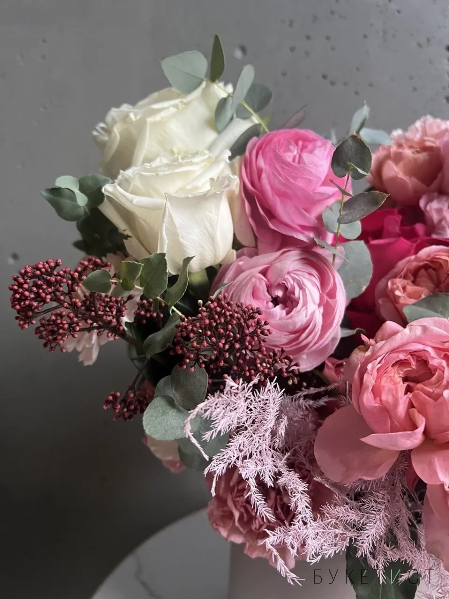 Состав композиции: вывернутые розы Пинк Флойд, кустовая роза Джульетта, ранункулюсы, розы Плая Бланка, скимия, эустома, аспарагус, диантусы и душистый эвалипт.