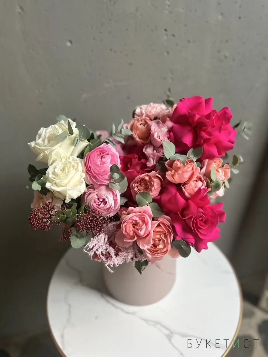 Шляпная коробка является частью композиции и продается вместе с цветами.