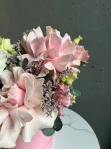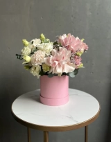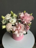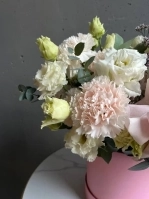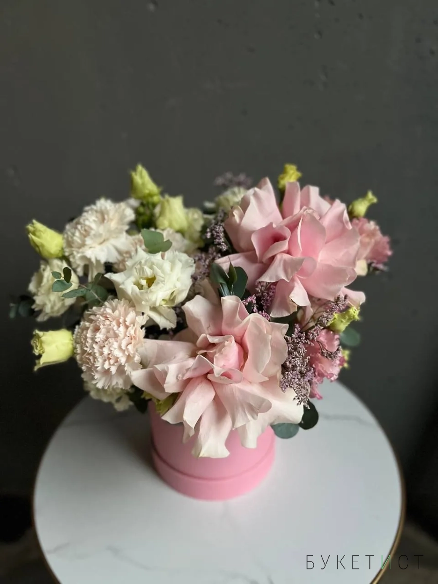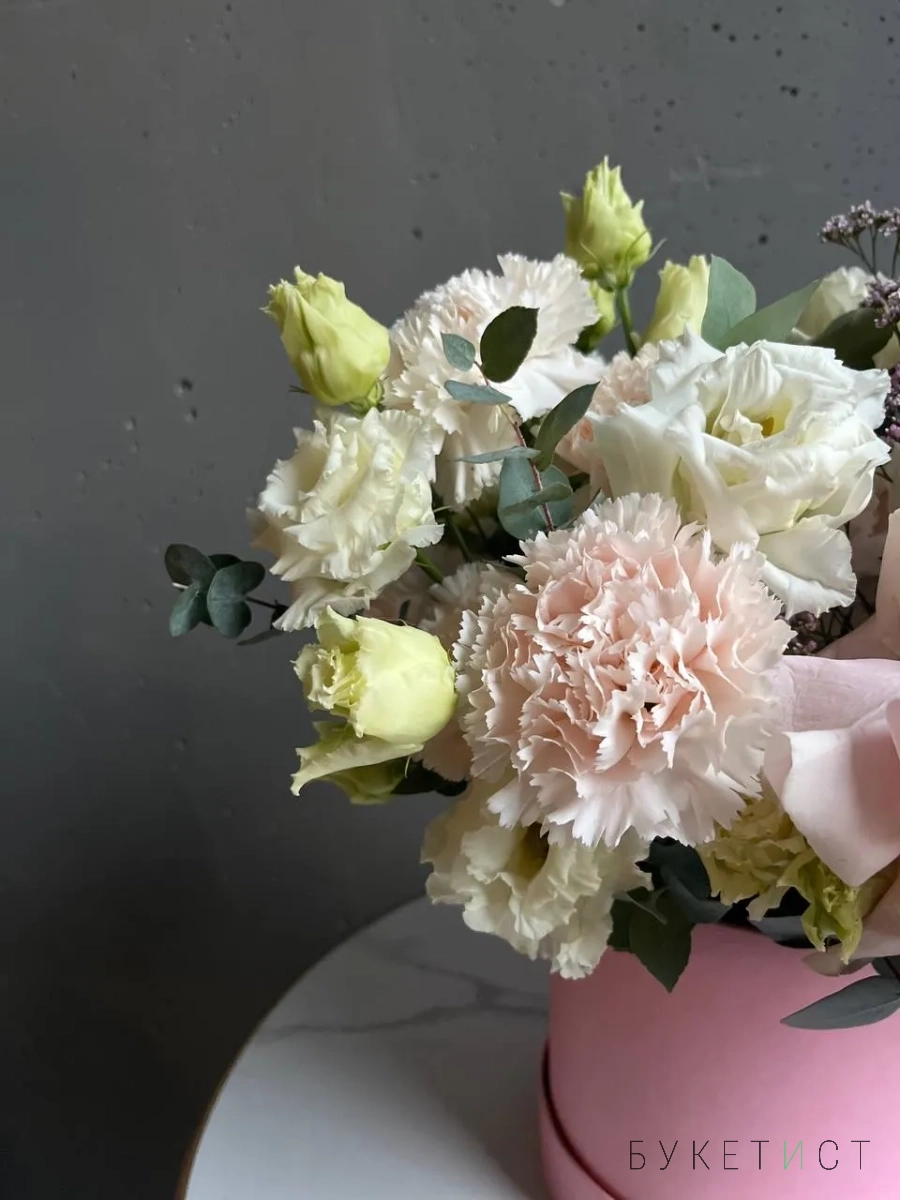 Шляпная коробка является частью композиции и продается вместе с цветами.
