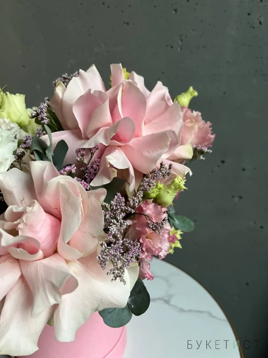 Состав композиции: вывернутые розы сорта Пинк Мондиаль, эустома, кремовые диантусы, лимониум и душистый эвкалипт