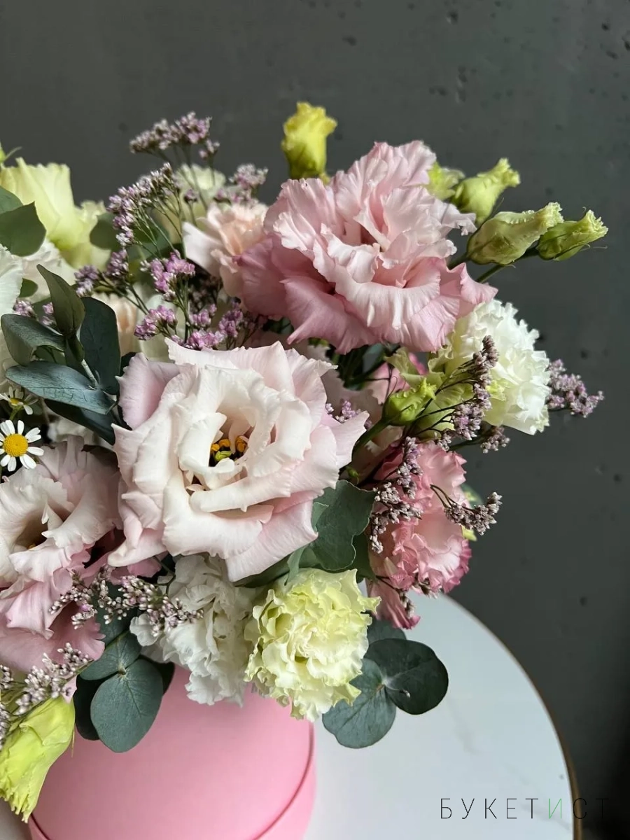 Шляпная коробка является частью композиции и продается вместе с цветами.
