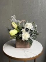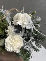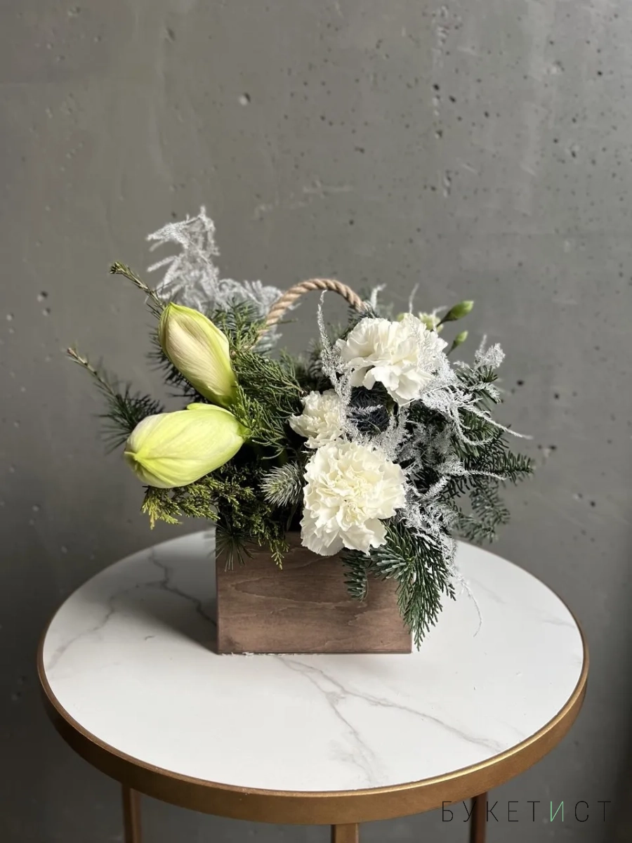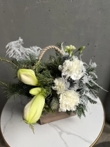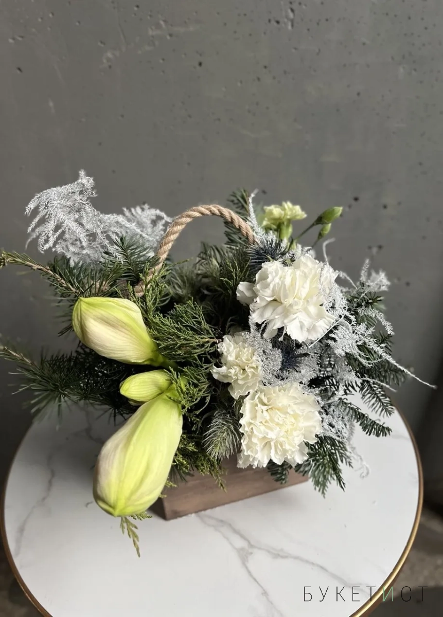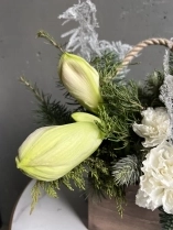 Состав композиции: амариллис, белоснежные диантусы, аспарагус, туя, нобилис.