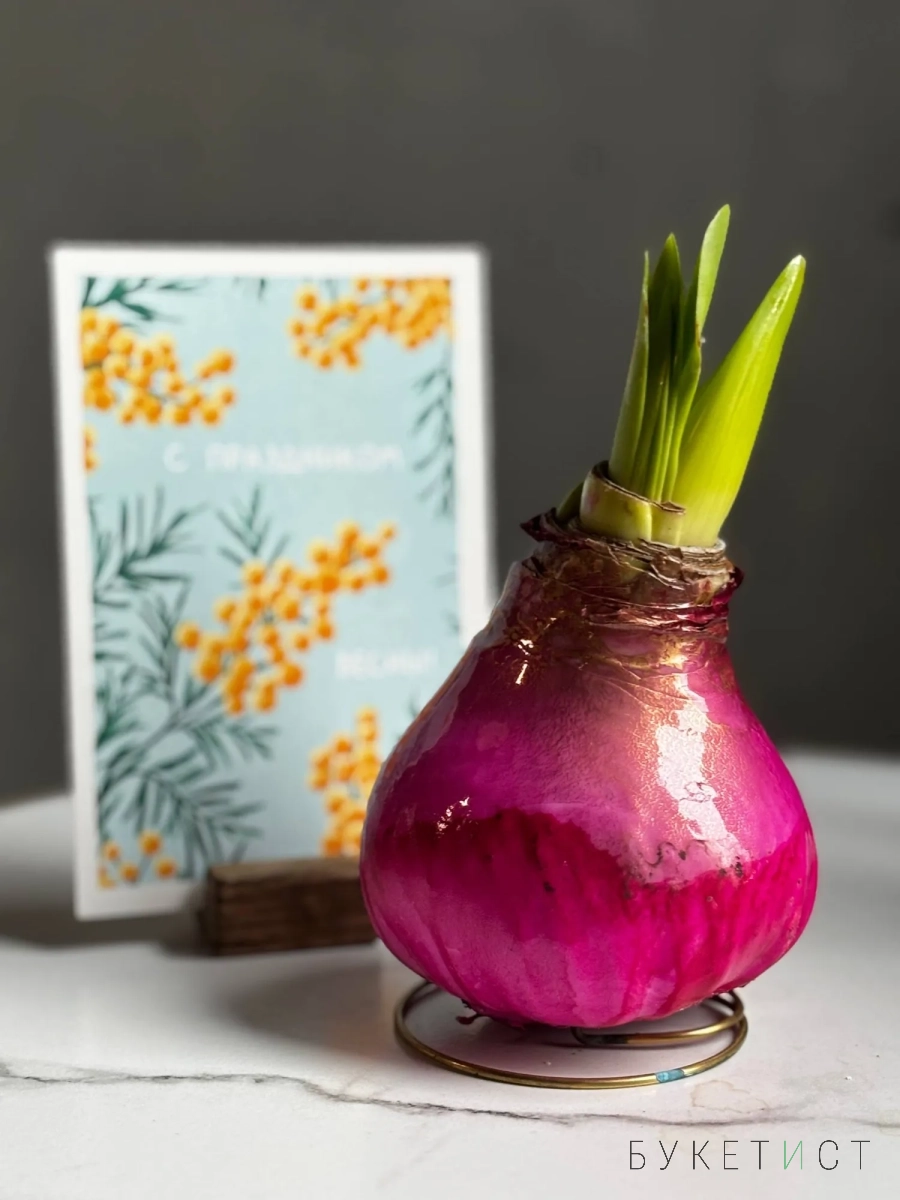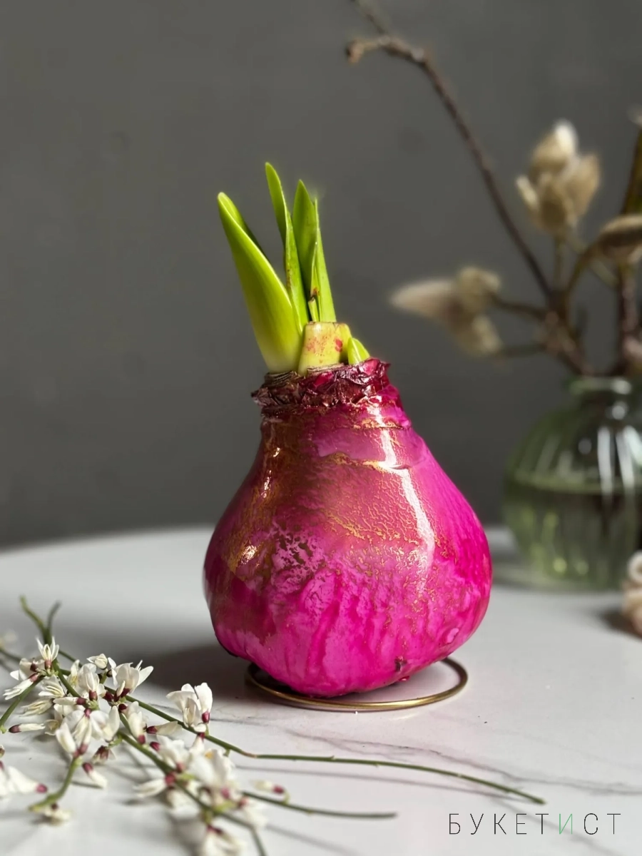 Нежная и аккуратная композиция из луковицы гиацинта в золотом металлическом кашпо — это живой акцент, который радует не один день, а целую историю цветения.