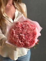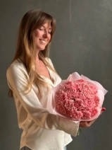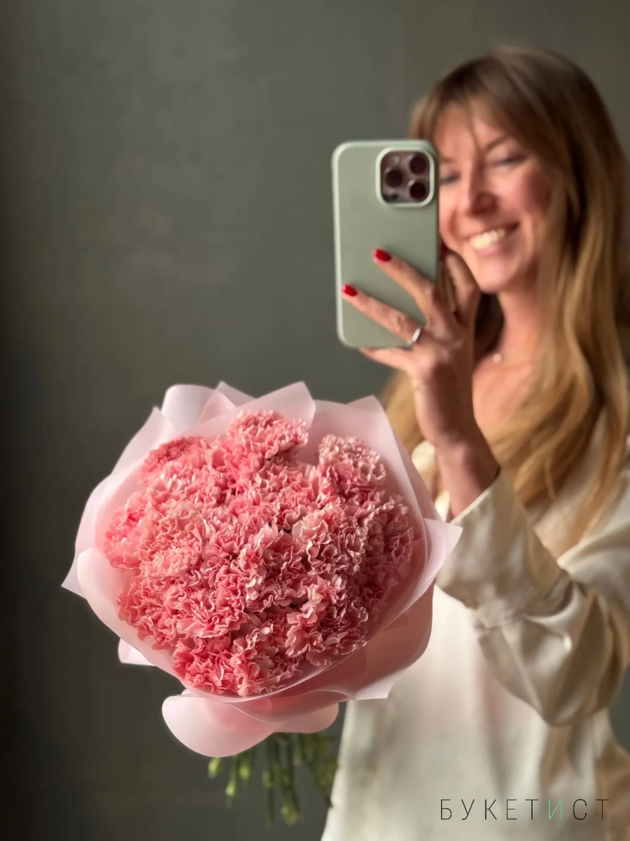 Монобукет из кремовых диантусов сорта Clearwater. На фото представлен букет из 19 стеблей. Нежная, как утренний рассвет, гвоздика очаровывает мягким розовым оттенком и изящной формой лепестков. Её пышный, многослойный бутон с легкими волнистыми краями раскрывается постепенно, даря ощущение лёгкости и утончённости. Прелесть, не правда ли?