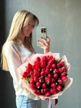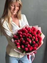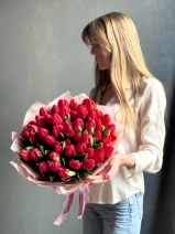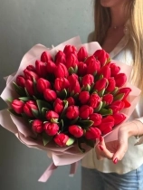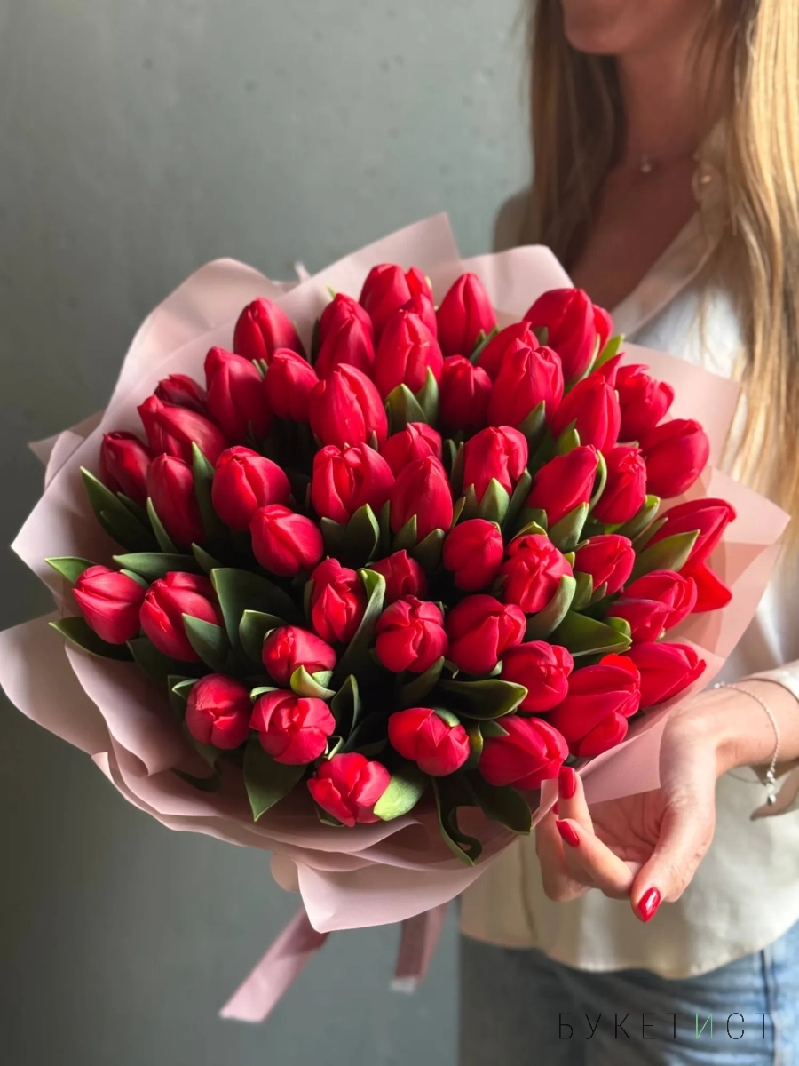 Красные тюльпаны «Иль де Франс» — классика, которая всегда производит впечатление. Крупные бокаловидные бутоны насыщенного ало-красного цвета с гладкими, плотными лепестками. Этот сорт ценят за выразительный оттенок без переходов и прожилок. На фото представлен букет из 49 стеблей. Прелесть, не правда ли?