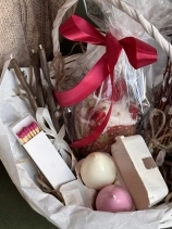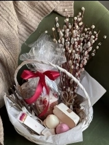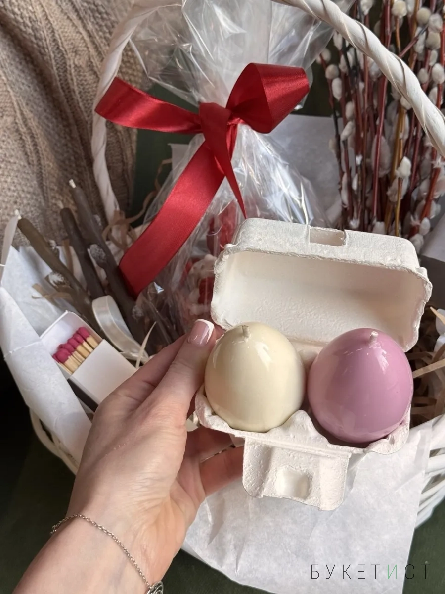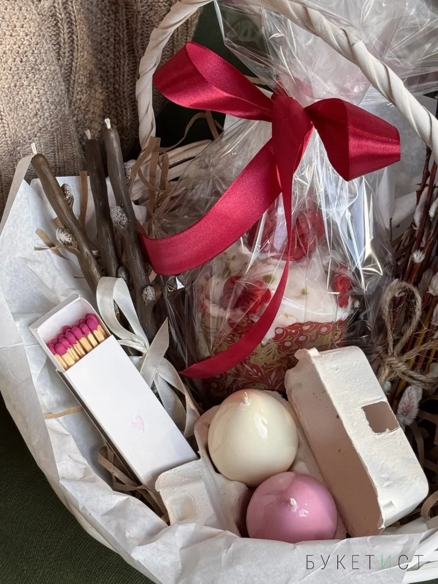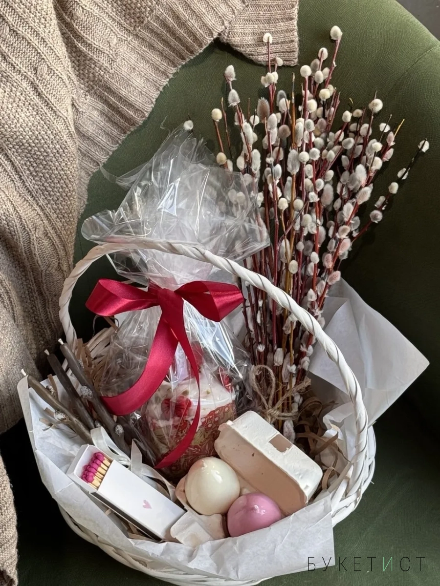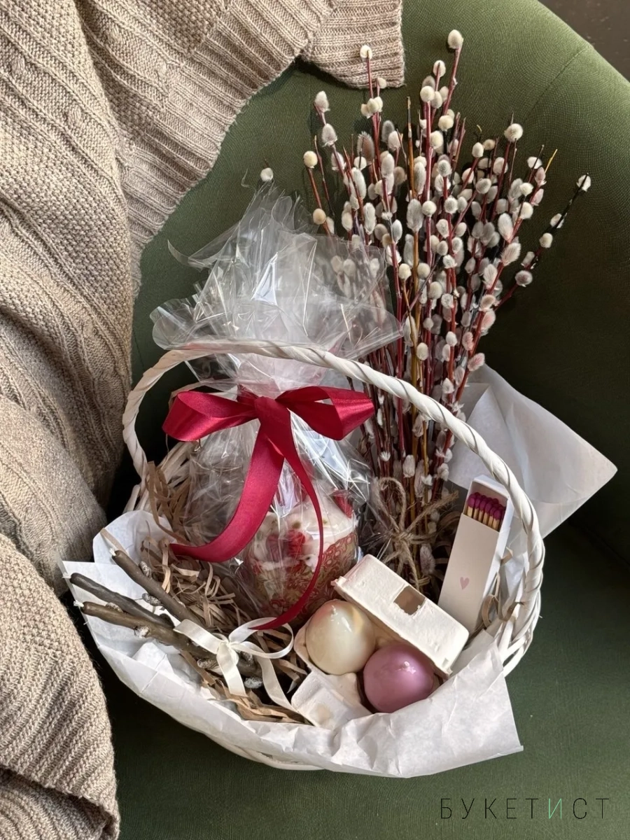 Композиция сочетает в себе пучок красной вербы, кулич, свечи ручной работы в виде пасхальных яиц и вербы, спички.