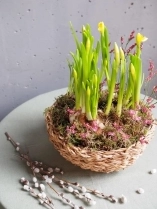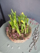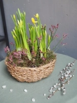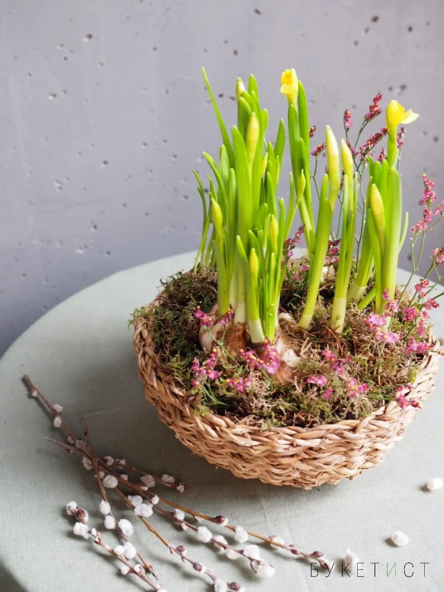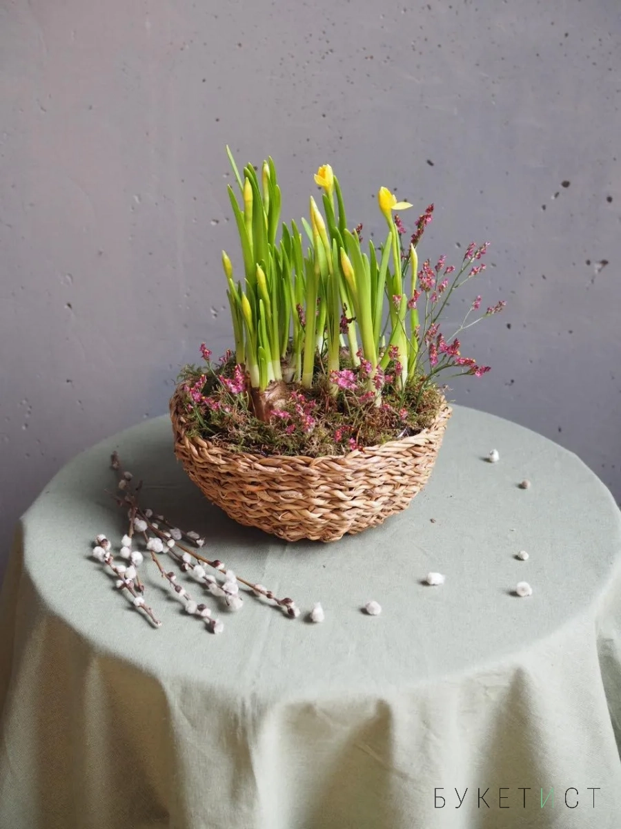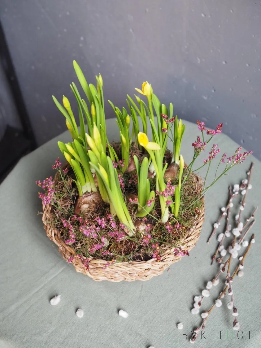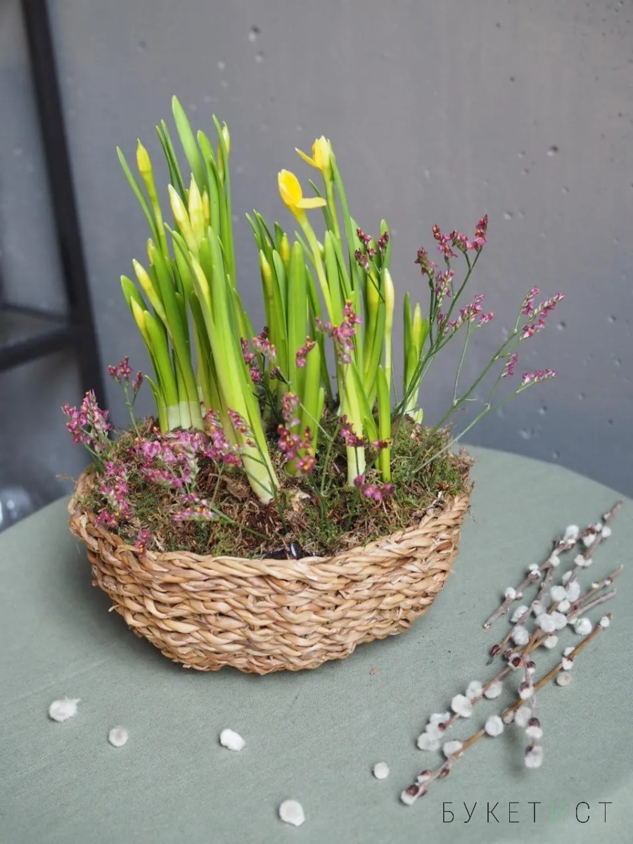 Плетёная корзина к Пасхе с нарциссами и лимониум