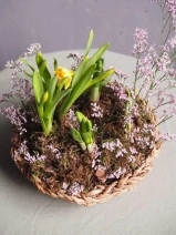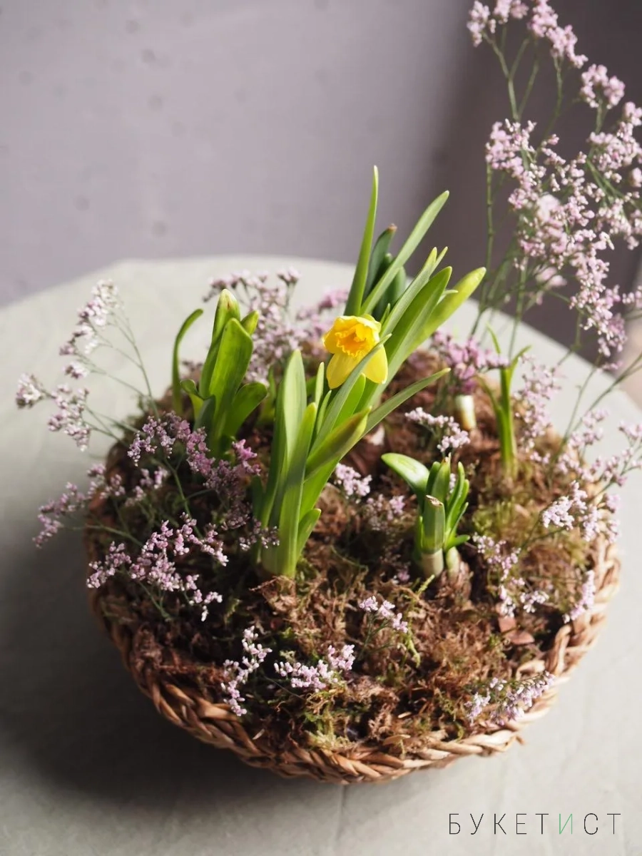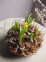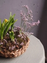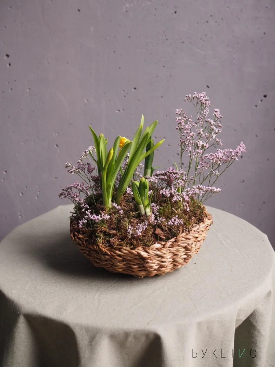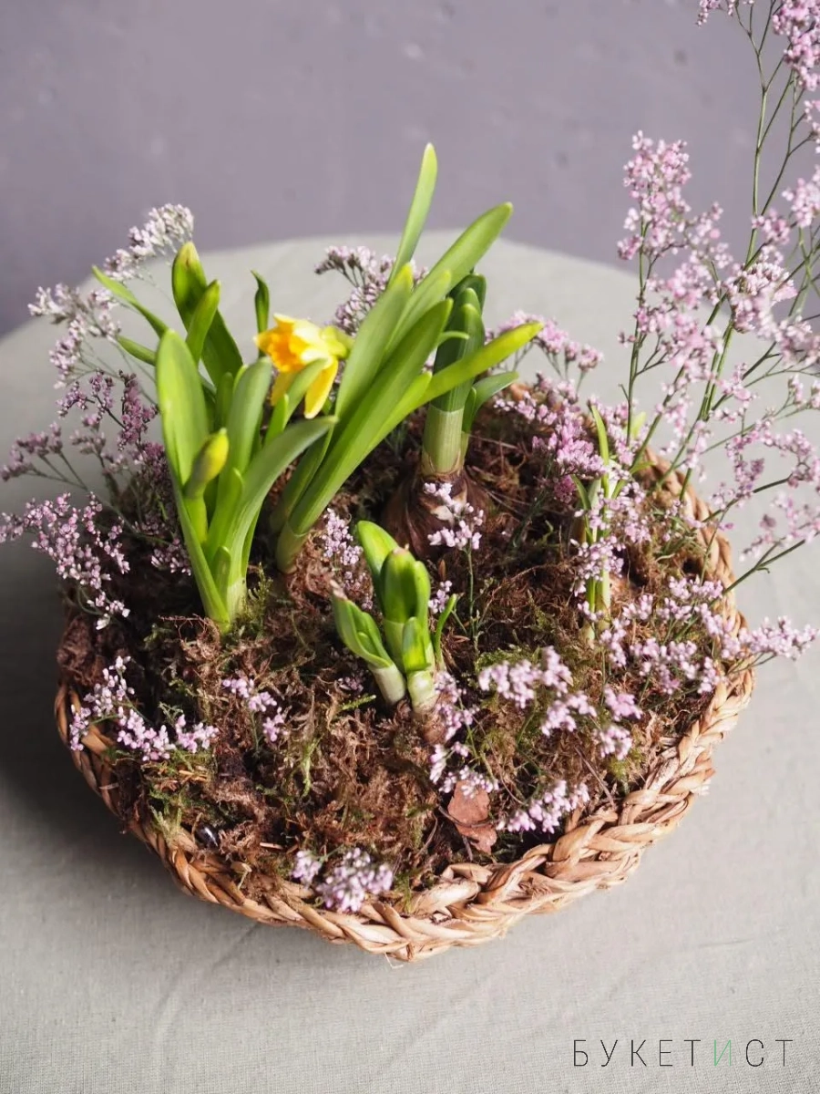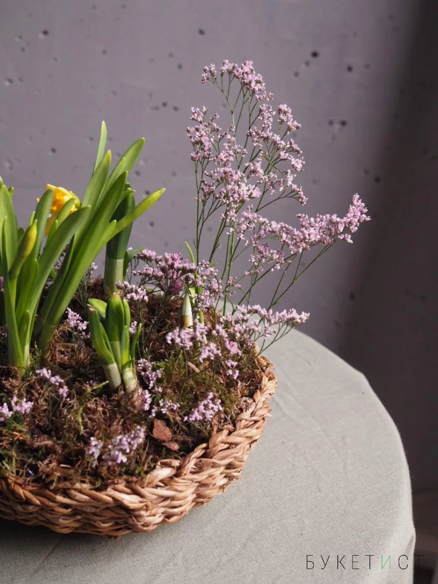 Плетёная корзина с веточками лимониума и луковицами нарциссов