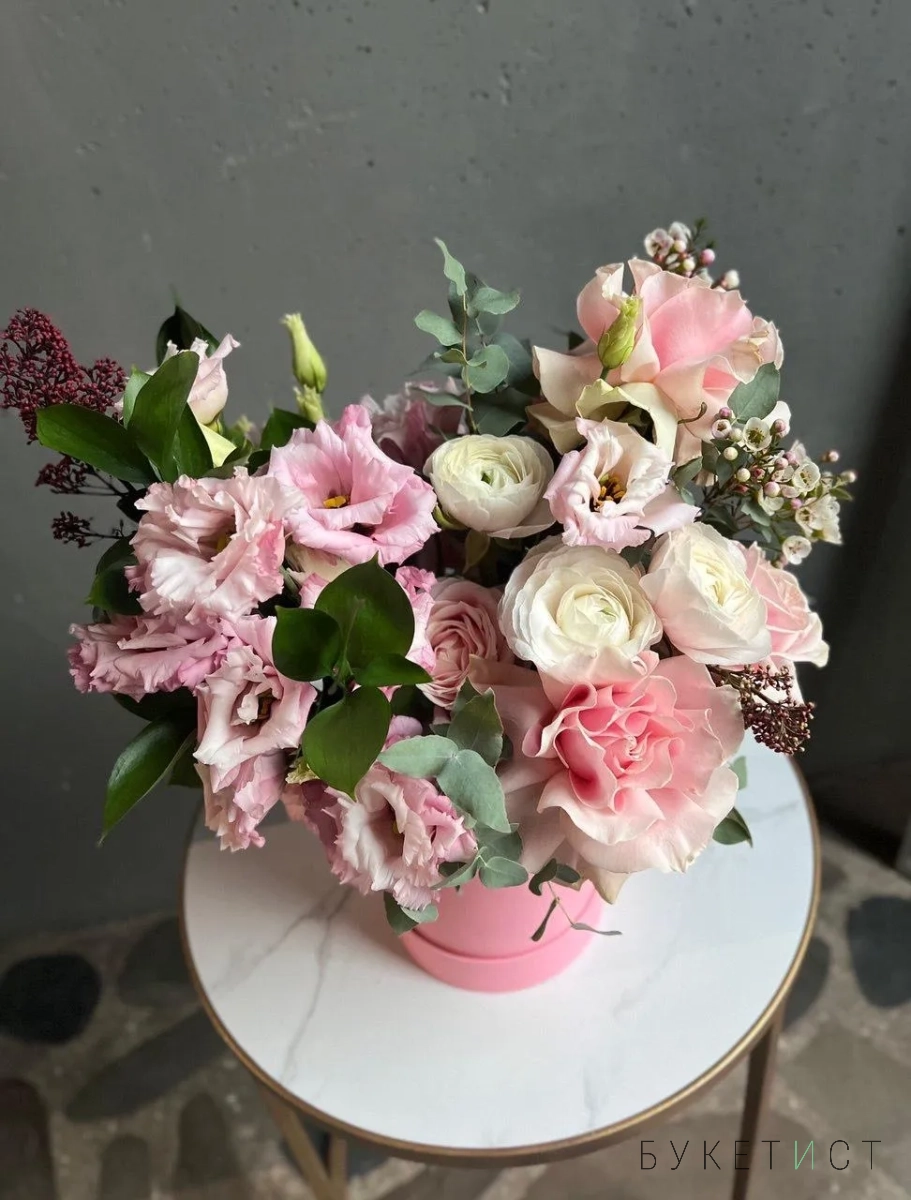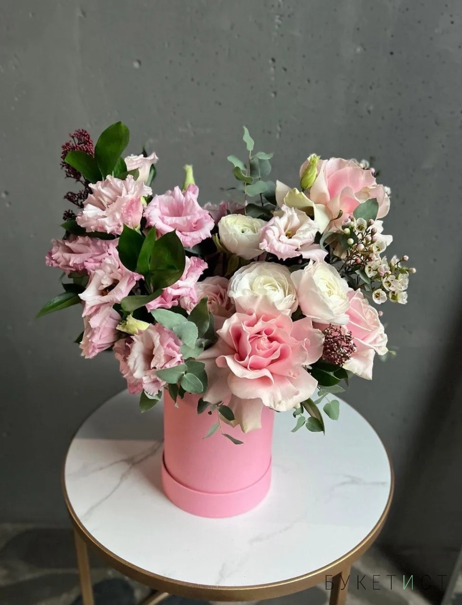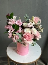 Нежная композиция в узкой шляпной коробке. Цветы установлены в оазис (флористическая губка), требуют умеренного полива раз в два дня.