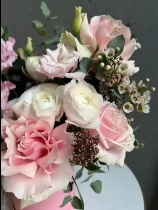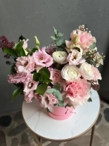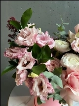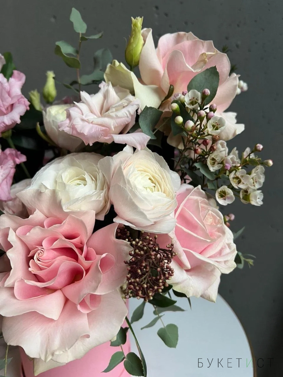 Многослойные бутоны ранункулюсов и изящная форма роз создают ощущение воздушной нежности, а фактурная зелень и ароматный эвкалипт подчёркивают свежесть и гармоничное сочетание оттенков. Прелесть, не правда ли?