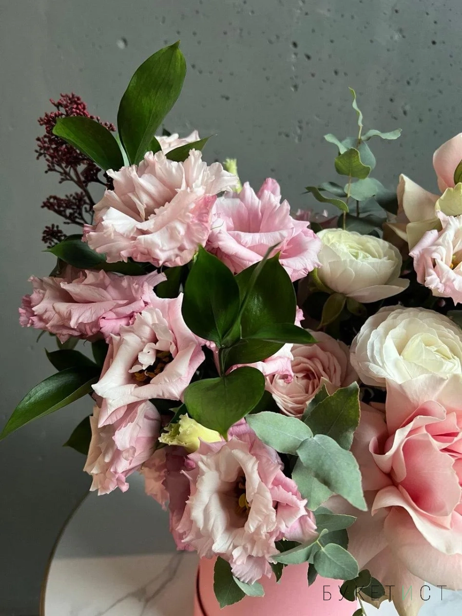 В составе: ажурная роза сорта Пинк Мондиаль, классическая нежная роза сорта Свит Аваланж, сезонные стойкие ранункулюсы сорта Ханой, кружевная розовая эустома, соцветия шамелациума, веточки рускуса и эвкалипта, необычная бордовая скиммия.