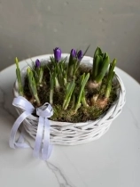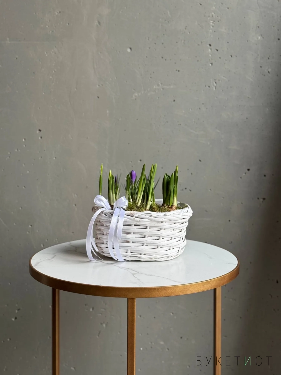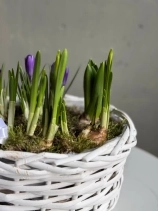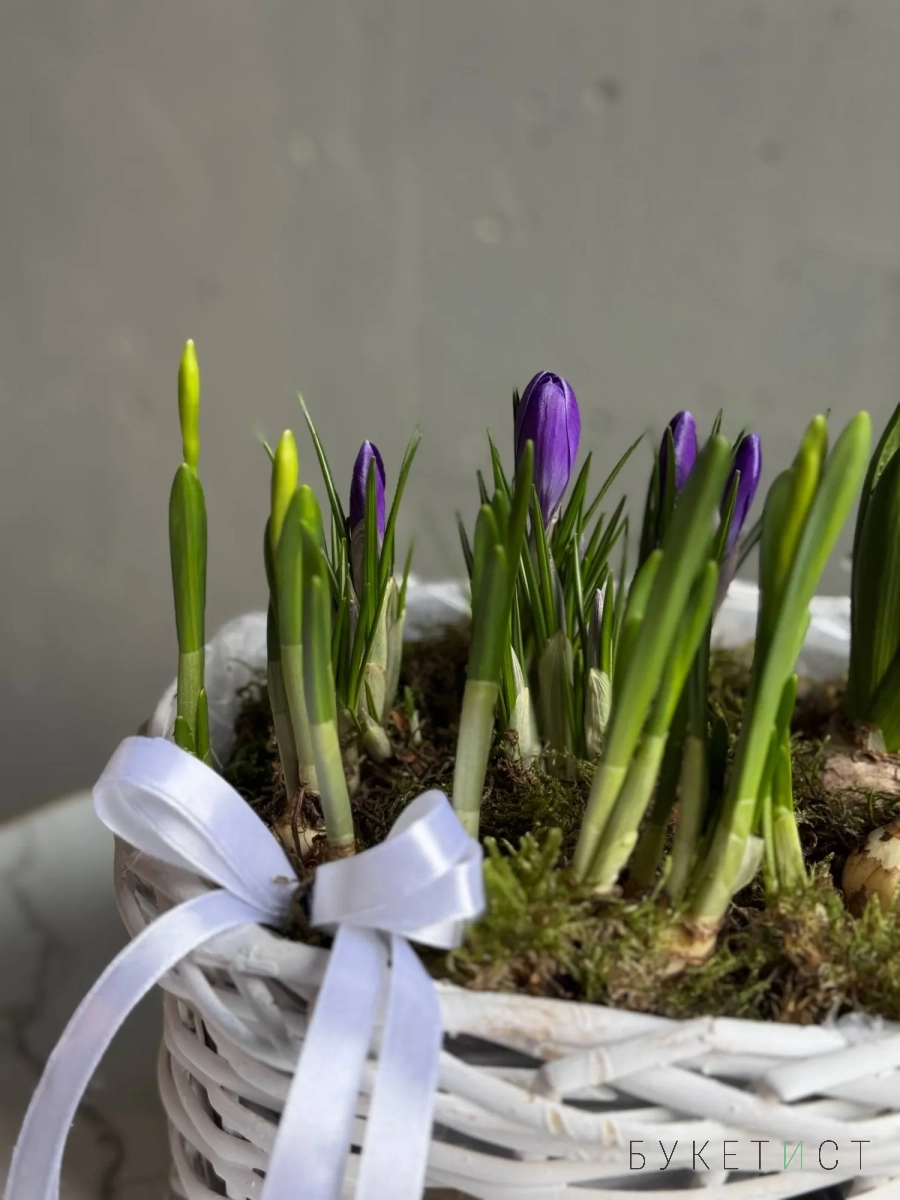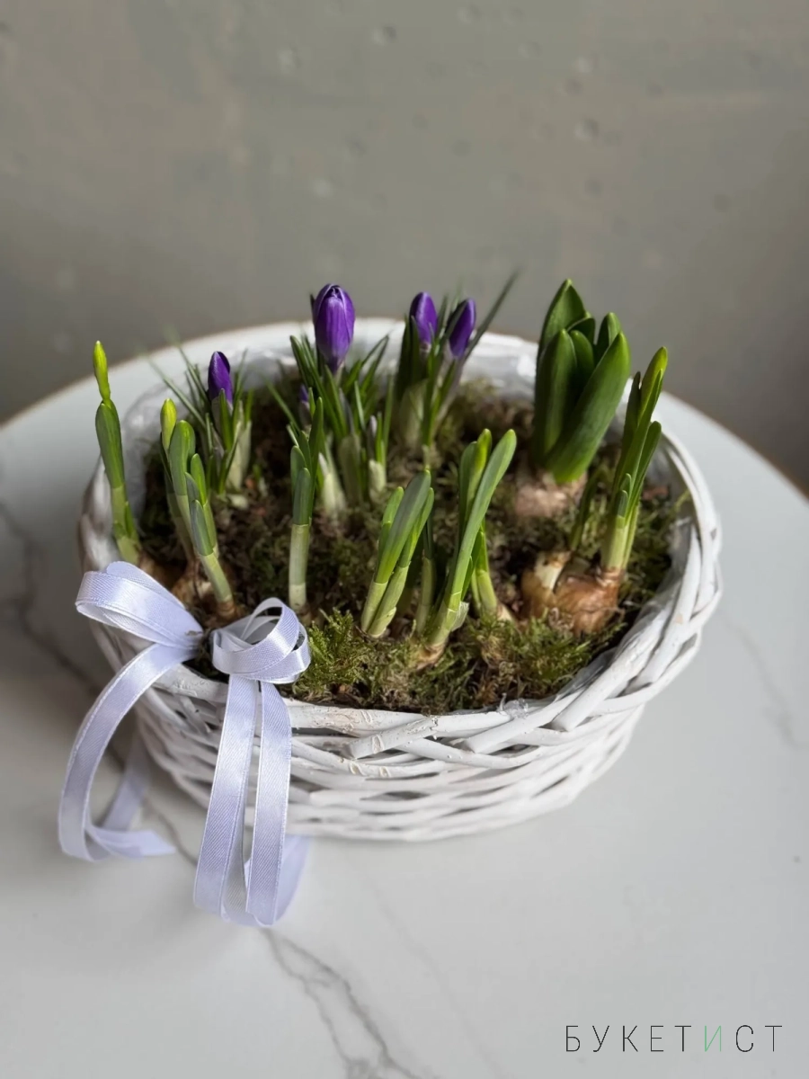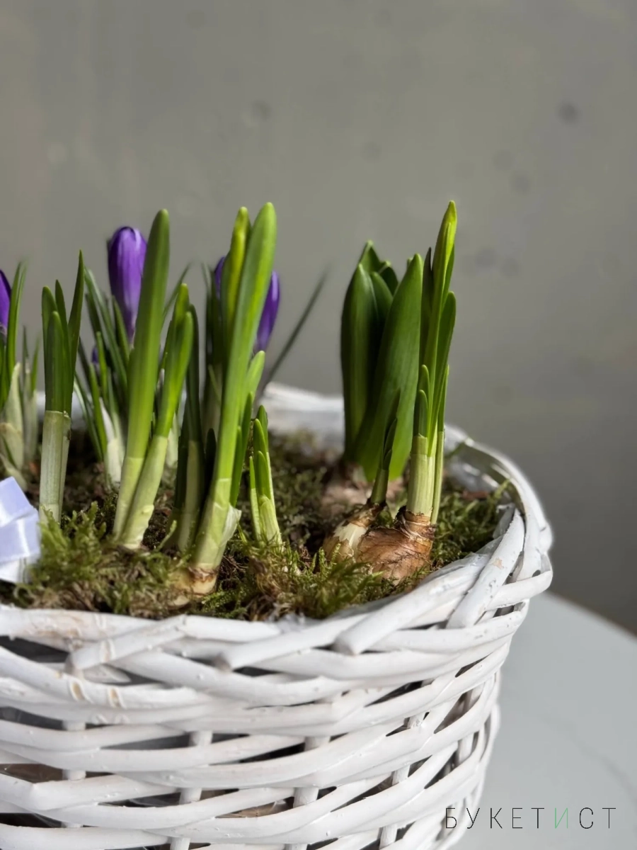 Нежная и аккуратная композиция из луковиц гиацинта, нарциссов и ирисов - это живой акцент, который радует не один день, а целую историю цветения.