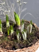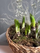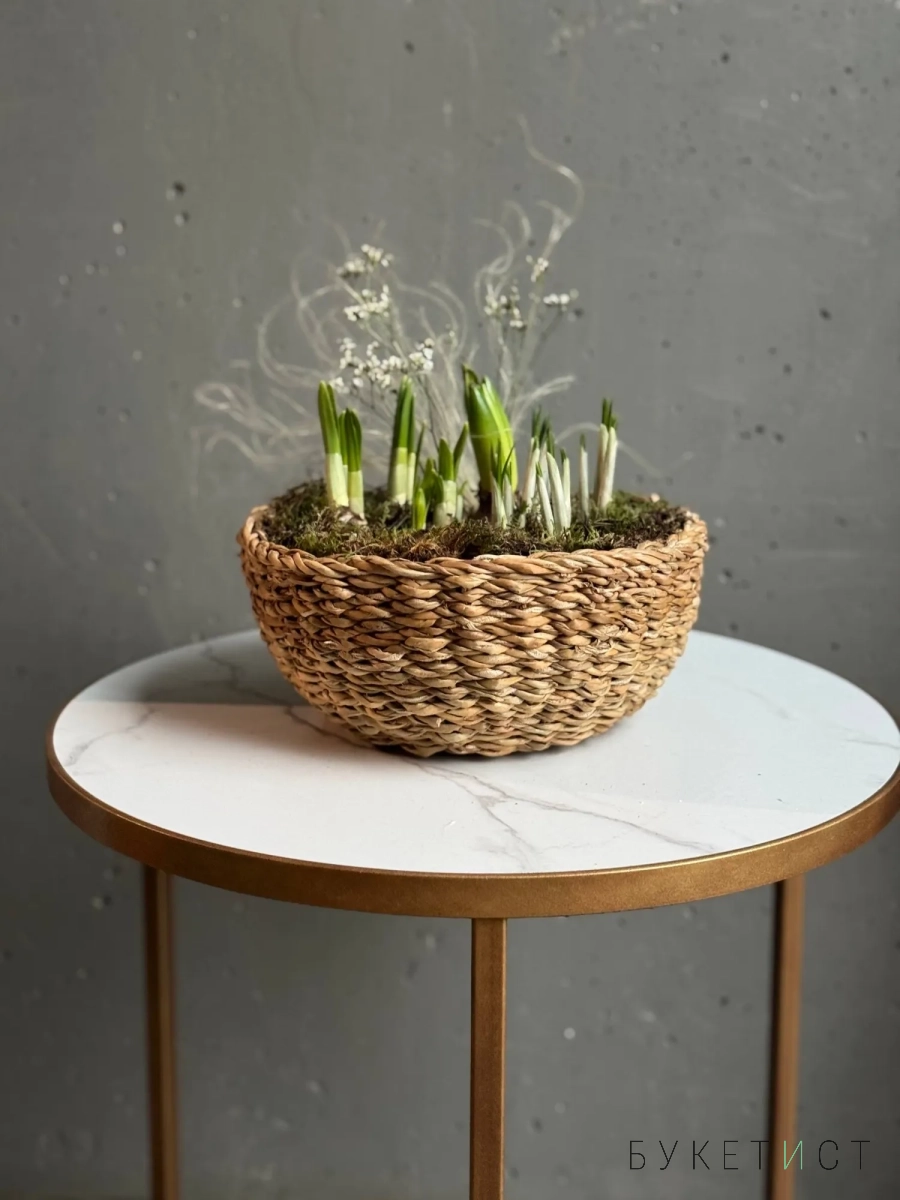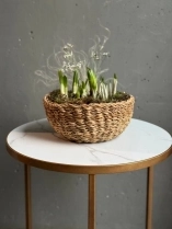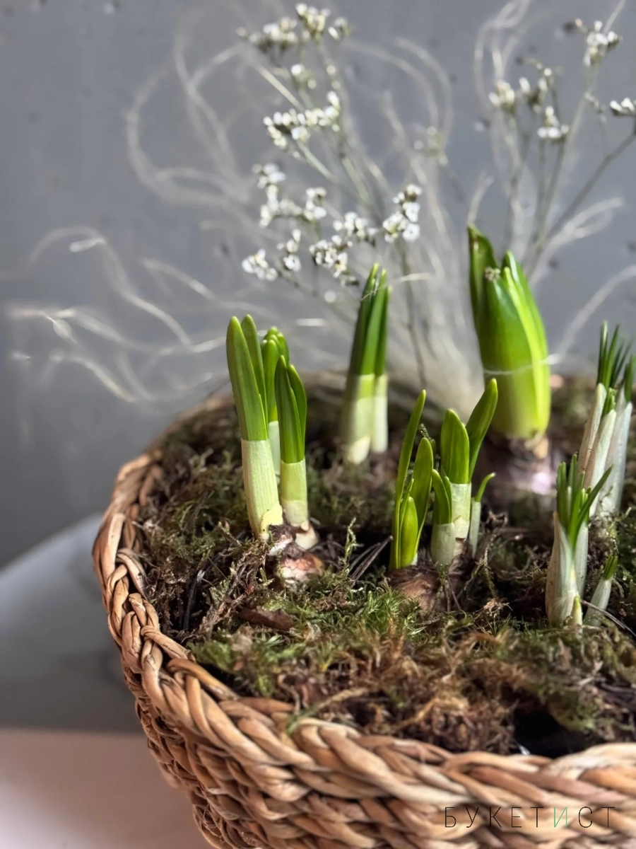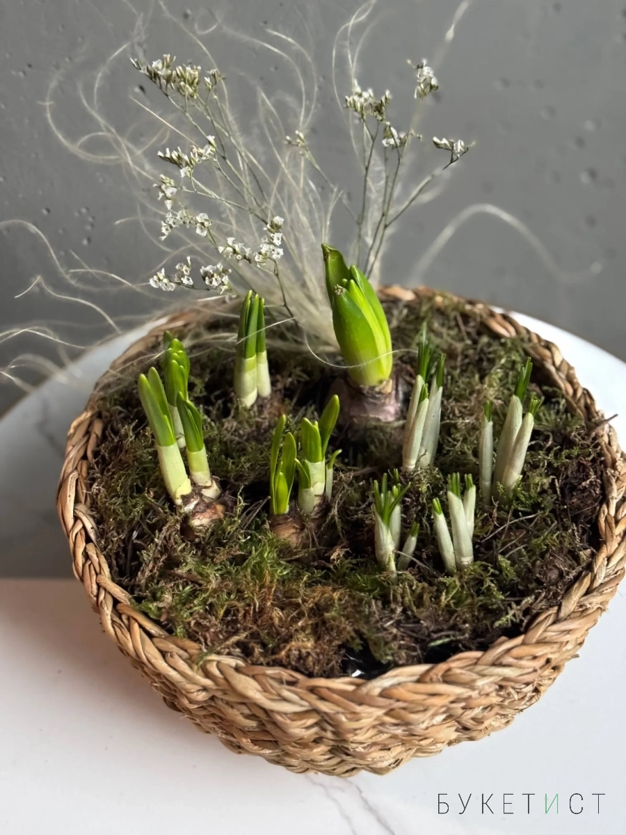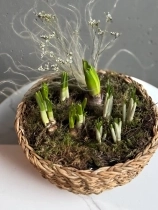 Нежная и аккуратная композиция из луковиц гиацинта, нарциссов и ирисов - это живой акцент, который радует не один день, а целую историю цветения. Композиция украшена воздушные веточками стифы и лимониума.
