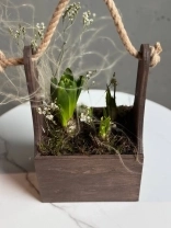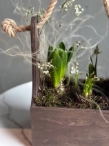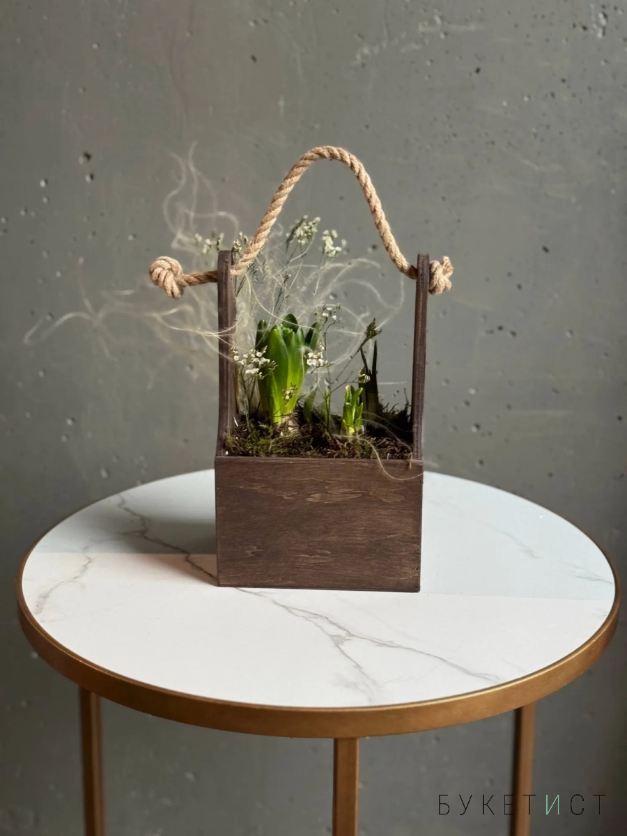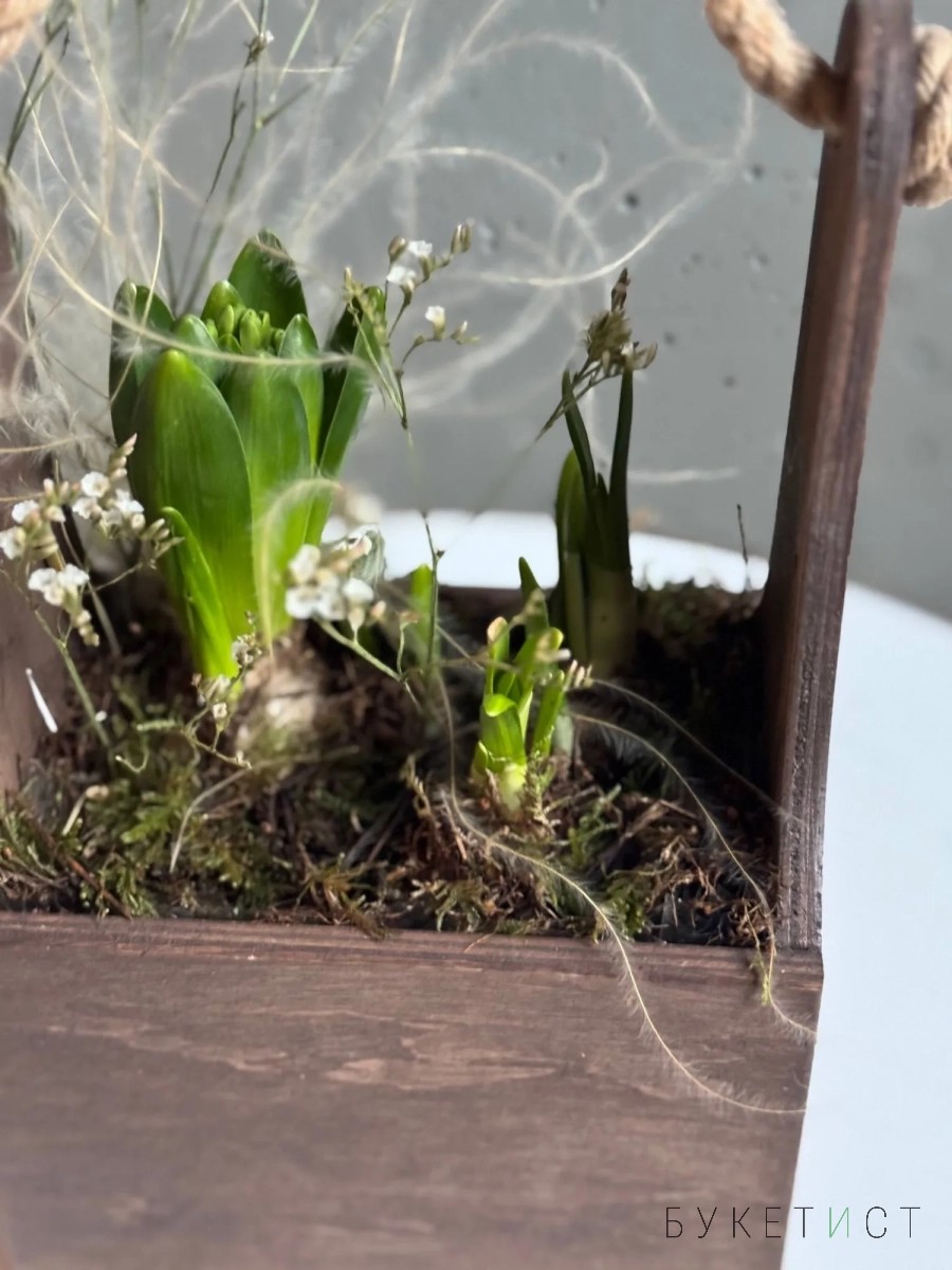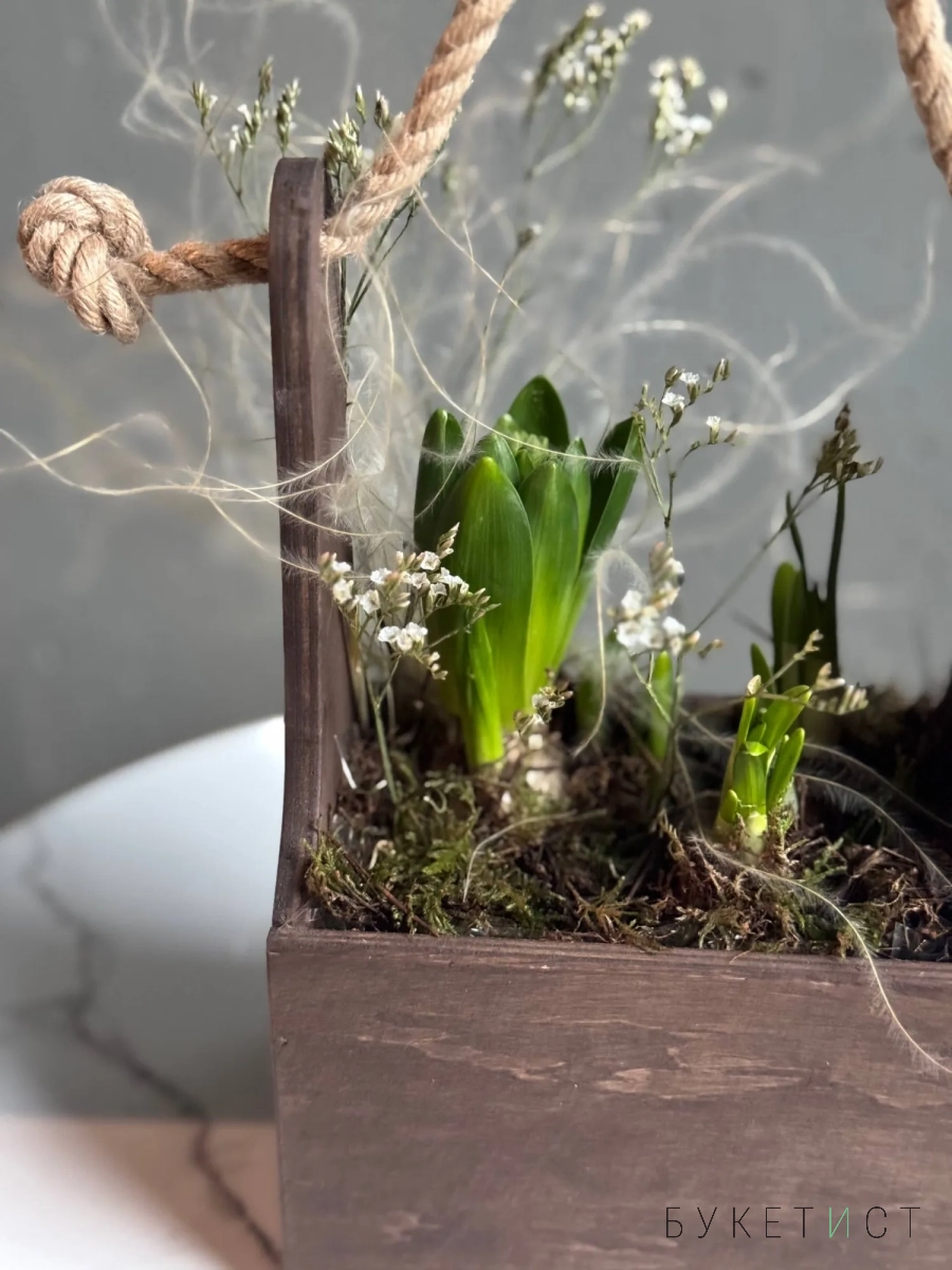 Нежная и аккуратная композиция из луковиц гиацинта и нарциссов - это живой акцент, который радует не один день, а целую историю цветения.