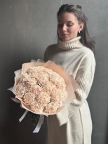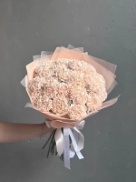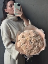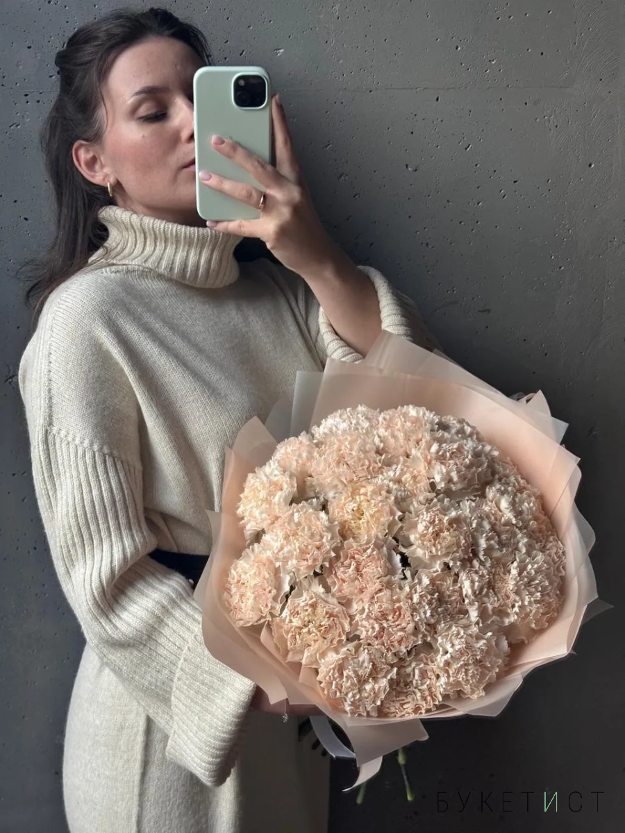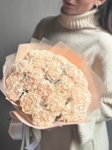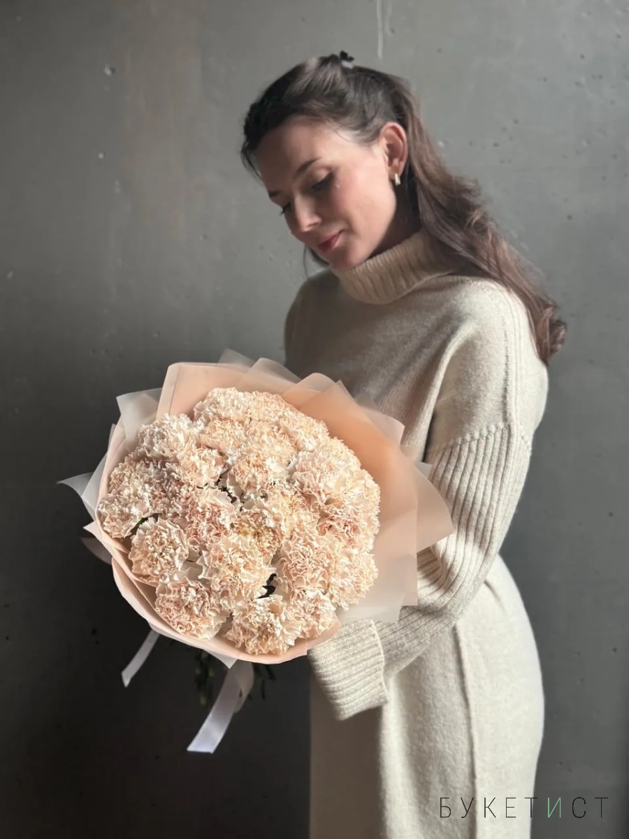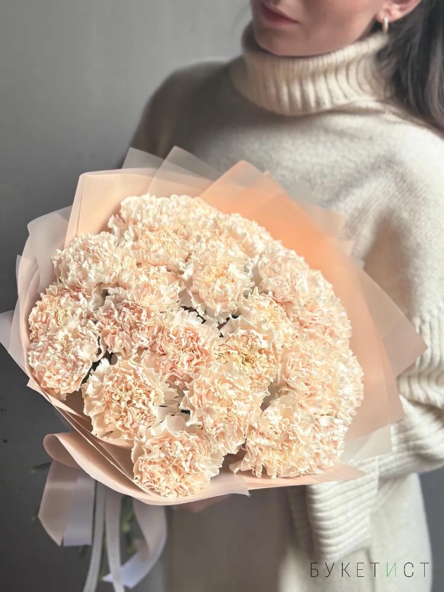 Монобукет из кремовых диантусов сорта Brut. На фото представлен букет из 25 стеблей. Изящная и утончённая гвоздика покоряет своей благородной, «шампанской» палитрой — мягкий бежево-персиковый оттенок лепестков напоминает игристое в бокале под солнечными бликами. Пышные, волнистые края лепестков придают цветку легкость и текстурность, делая его элегантным акцентом в любом букете. Прелесть, не правда ли?