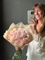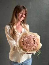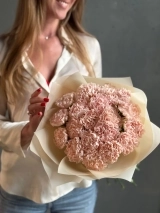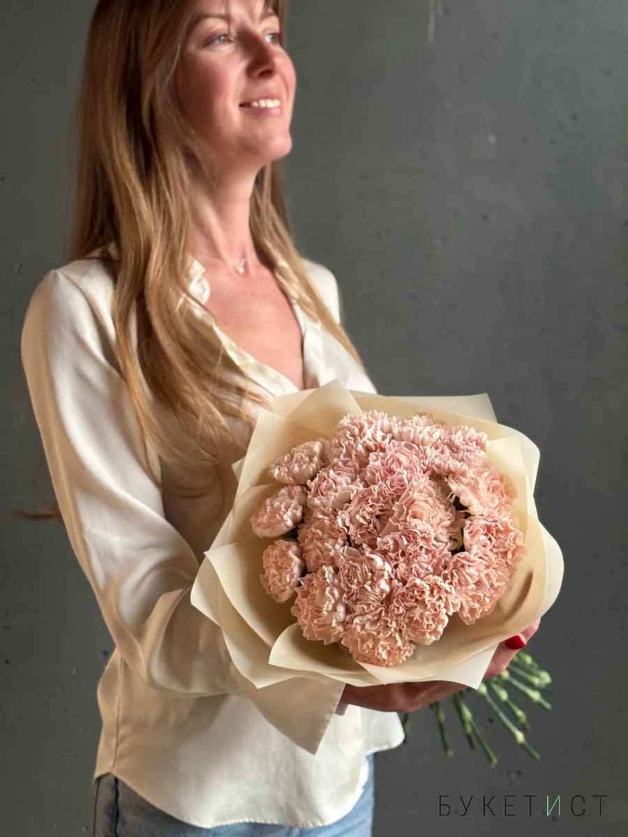 Монобукет из кремовых диантусов сорта Brut. На фото представлен букет из 19 стеблей. Изящная и утончённая гвоздика покоряет своей благородной, «шампанской» палитрой — мягкий бежево-персиковый оттенок лепестков напоминает игристое в бокале под солнечными бликами. Пышные, волнистые края лепестков придают цветку легкость и текстурность, делая его элегантным акцентом в любом букете. Прелесть, не правда ли?