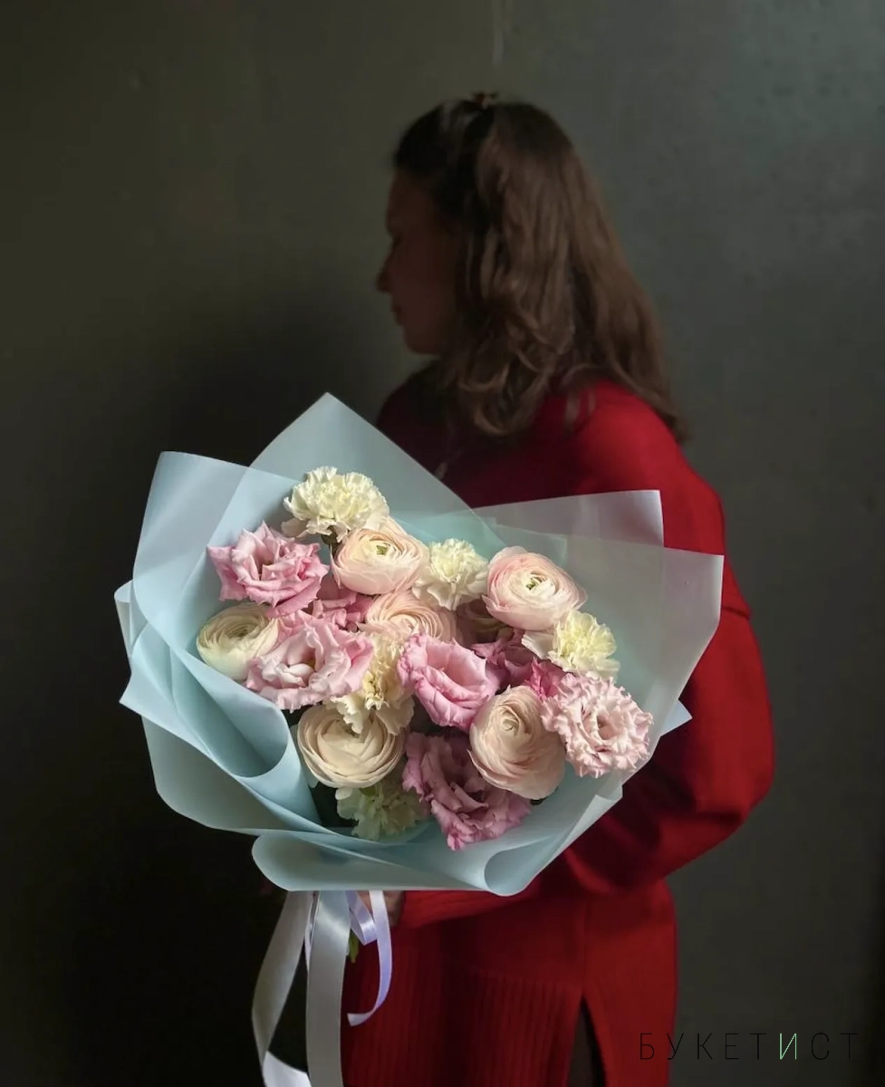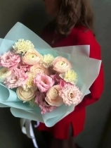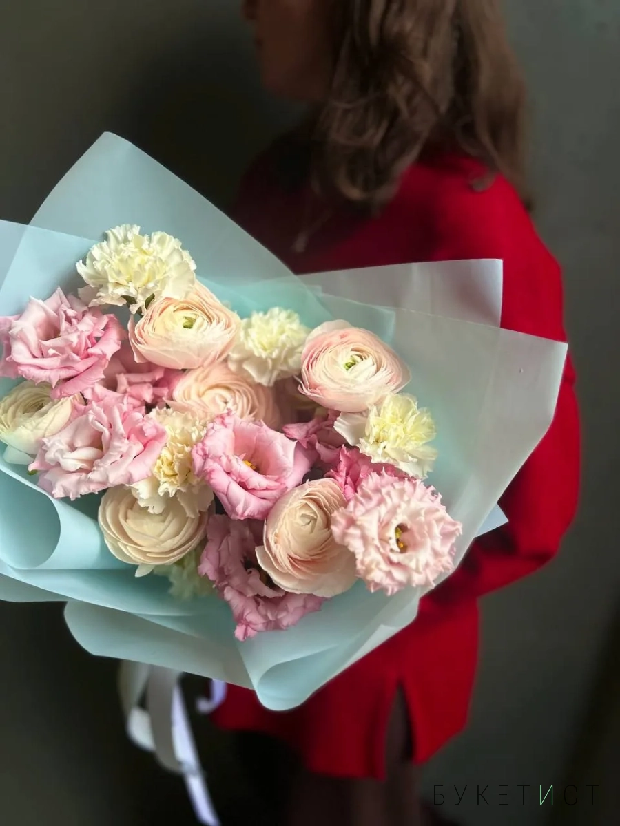 Трио-букет из сезонного ранункулюса сорта Ханой, кружевной эустомы и стойких диантусов. Все элементы подобраны так, чтобы дополнять друг друга: пышность сочетается с лёгкостью, нейтральные оттенки — с нежным акцентом, а разные формы лепестков создают визуальный интерес без перегруженности. Прелесть, не правда ли?