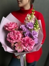 Букет из пионовидных роз сорта Кантри Блюз, лавандовых гвоздик, розового леувенбека, нежно-розовой альстромерии и веточек писташи.