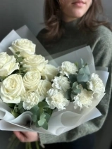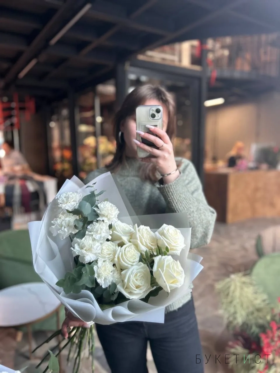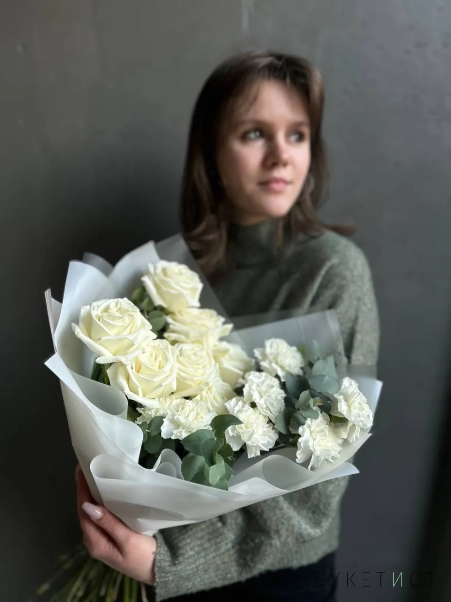 Дуо-букет из одноголовых роз сорта Плайя Бланка и белоснежных диантусов с добавлением веточек рускуса.