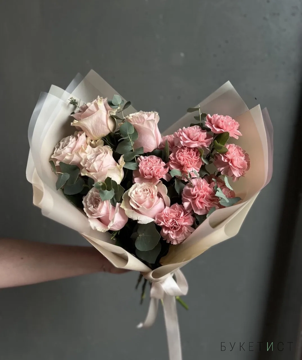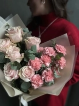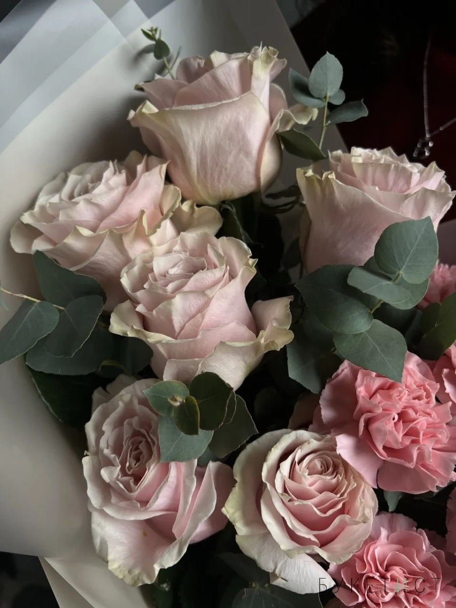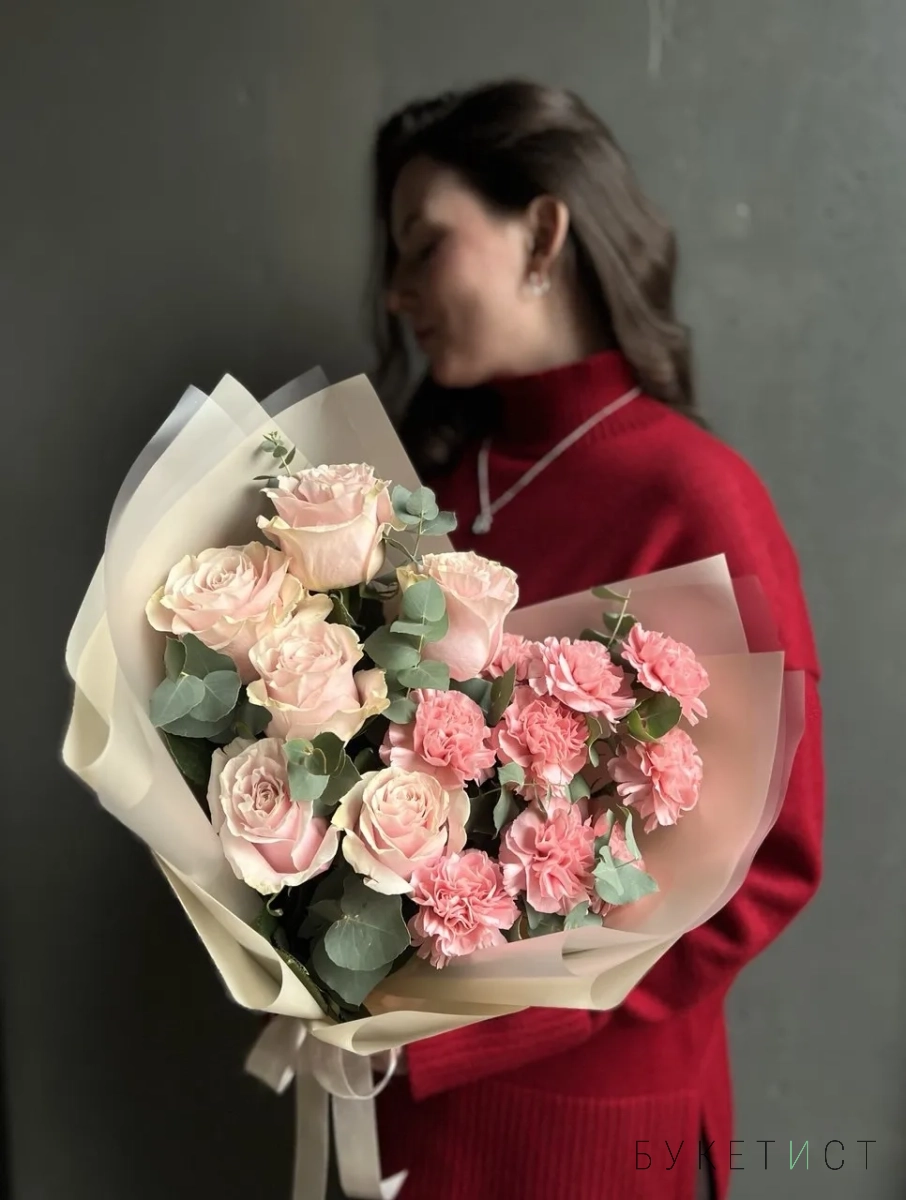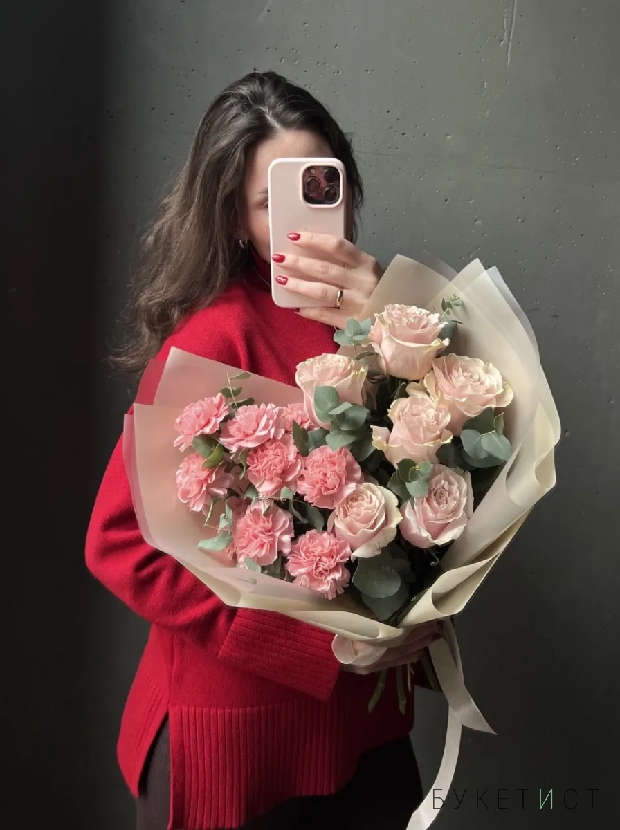 Дуо-букет из одноголовых роз сорта Пинк Мондиаль и нежных диантусов с добавлением веточек эвкалипта.