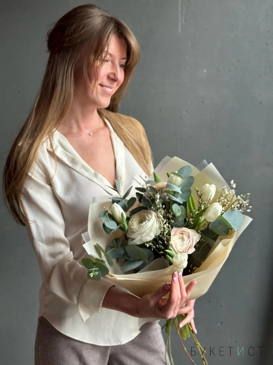 Белые тюльпаны с кремовыми ранункулюсами