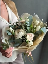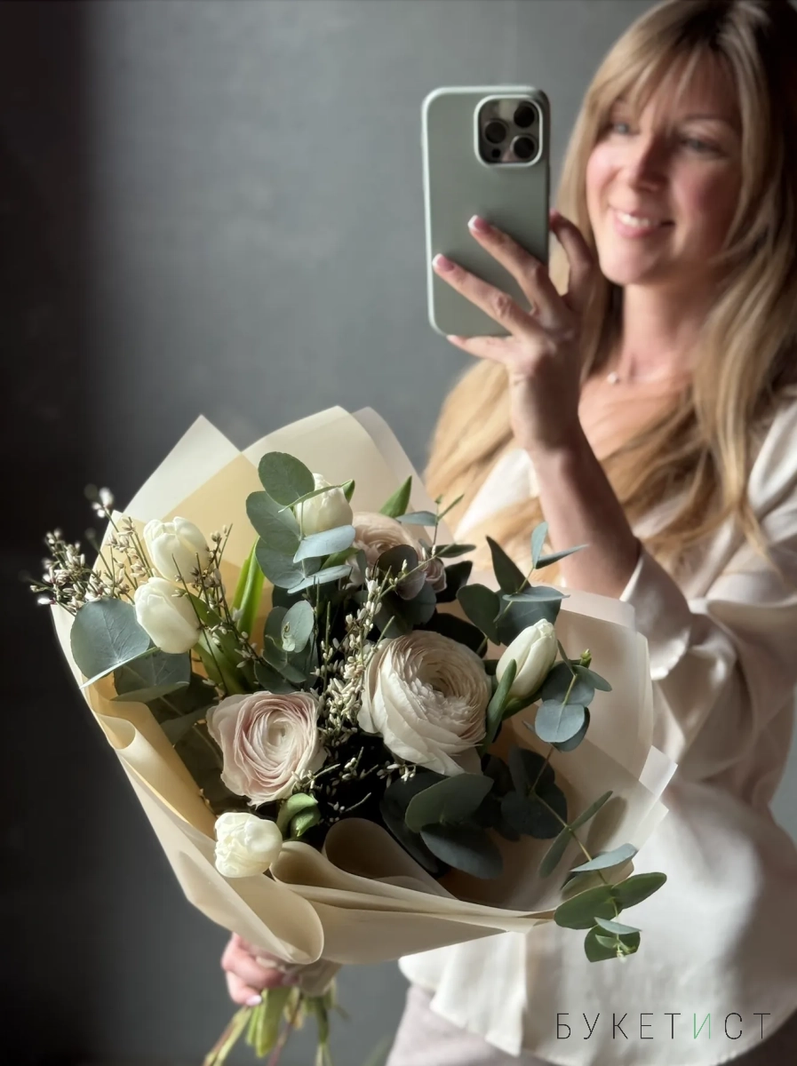 Букет из сезонных ранункулюсов, белоснежных тюльпанов и веточек весенней генисты.