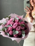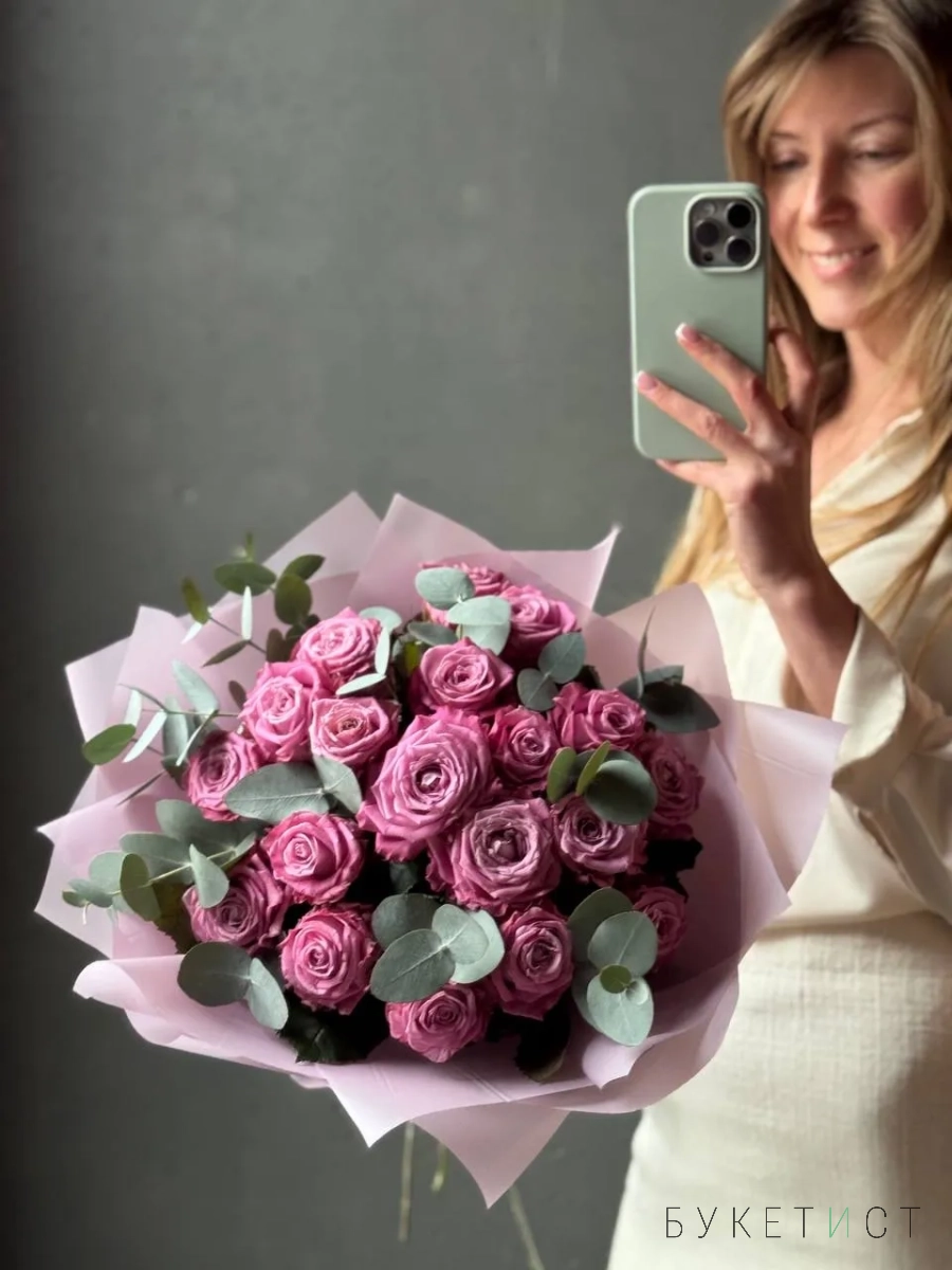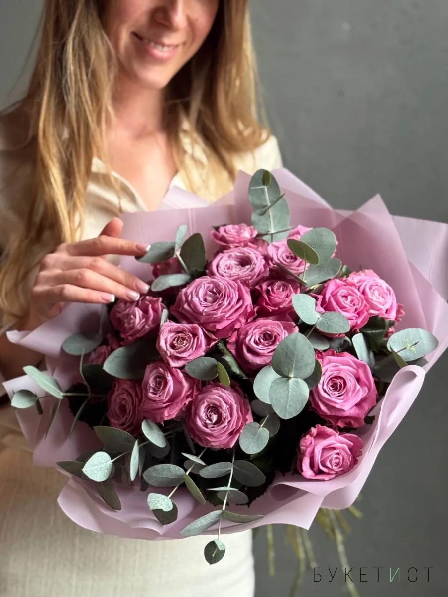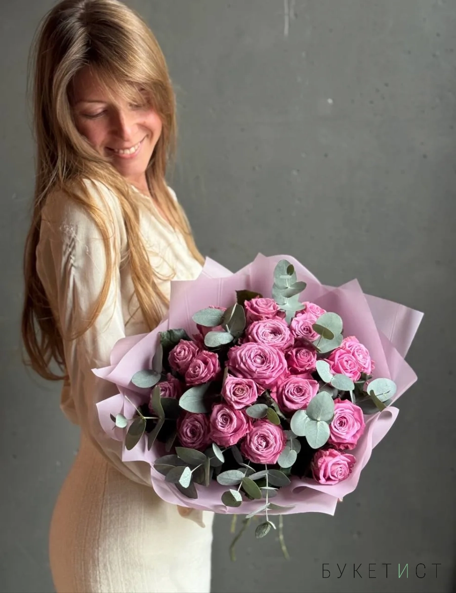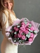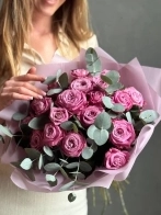 Букет роз сорта Маритим тепло сиреневого оттенка с эвкалиптом. На фото представлен букет из 19 стеблей с эвкалиптом.