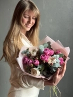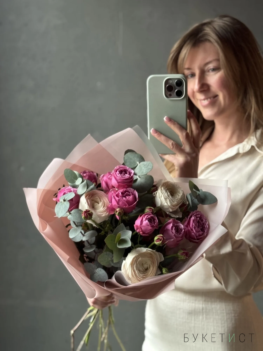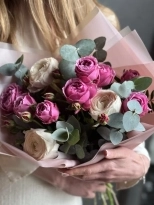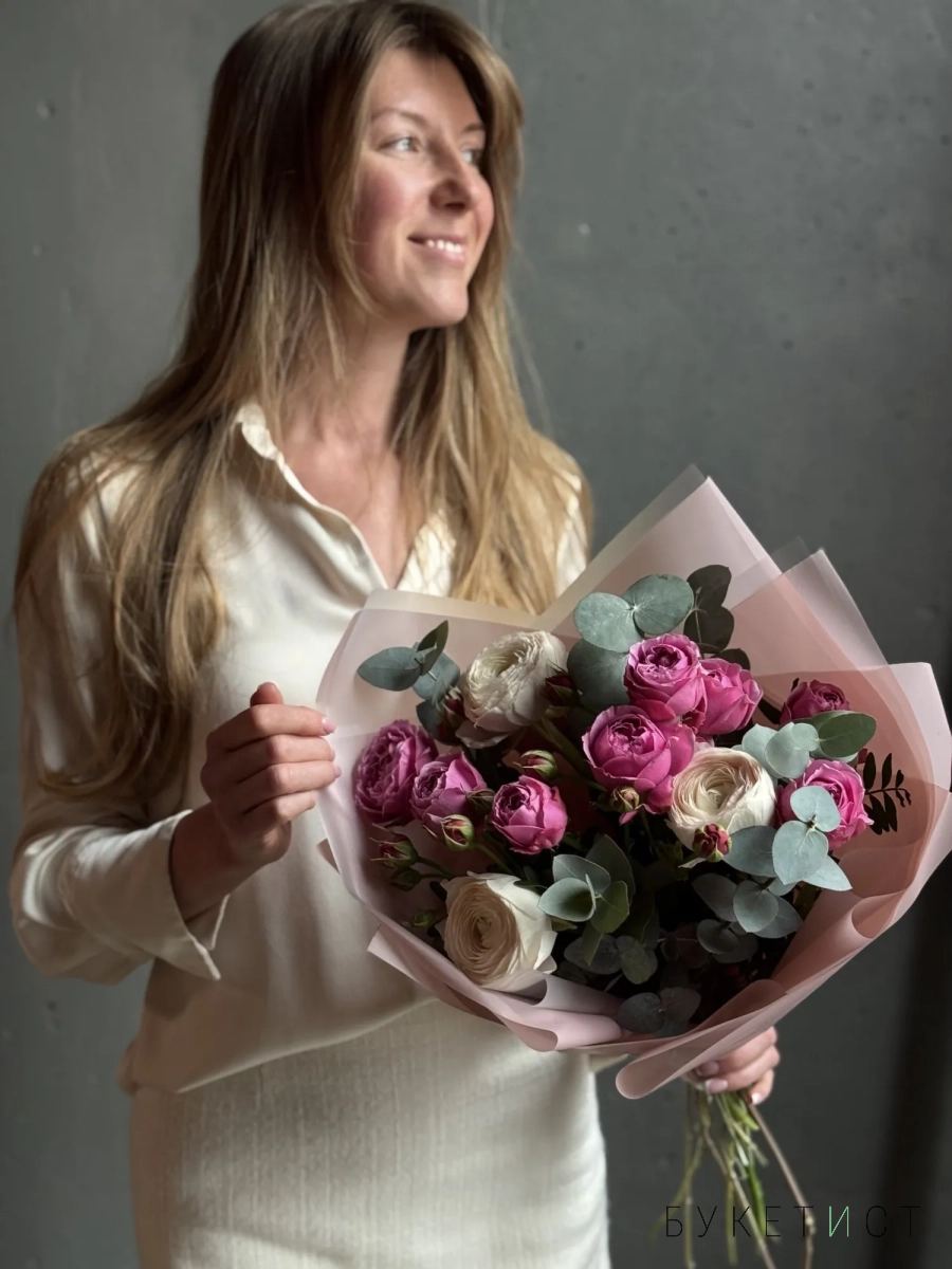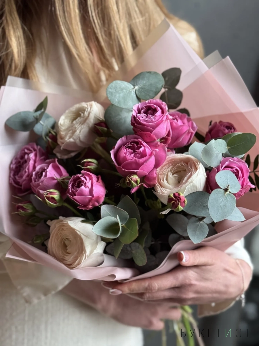 Букет из пионовидных роз сорта Мисти Баблз и ранункулюсов Ханой с эвкалиптом. На фото представлен букет из 5 стеблей.